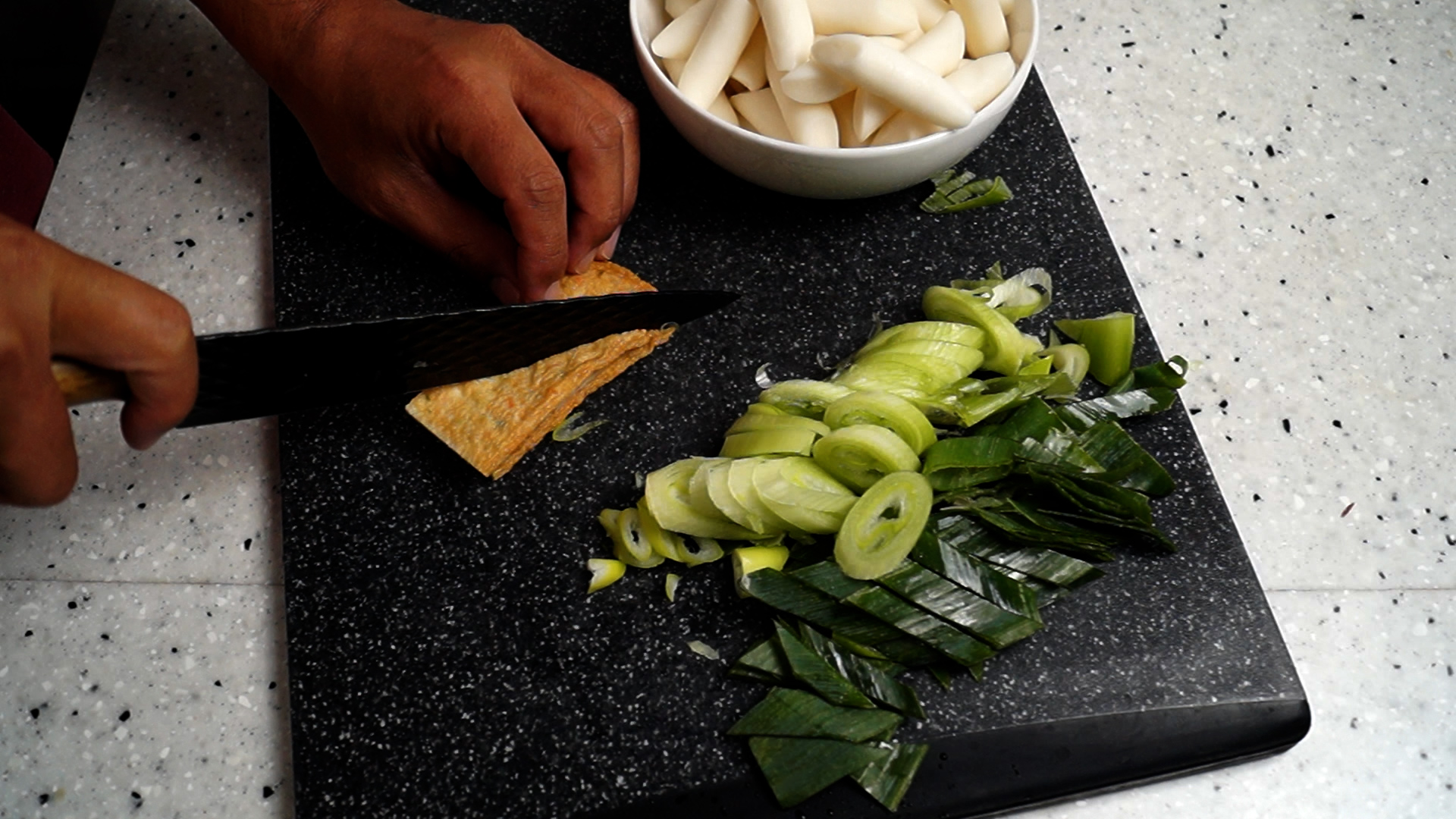 3. 사각어묵 3장을 기호에 맞게 먹기좋은 크기로 잘라주세요. 어묵이 모자라면 떡으로 대체하시면 됩니다.