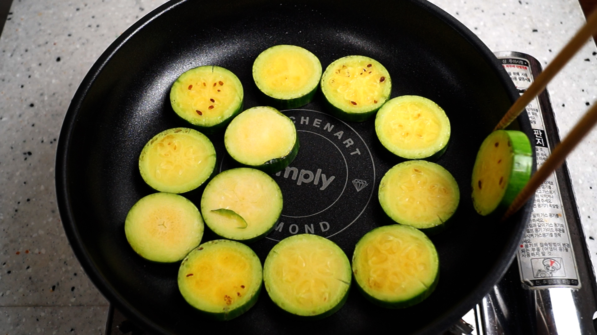 7. 호박은 겹치지 않게 팬에 올려주세요. 24cm 팬을 사용 하시면 1cm 두께로 자른 호박을 전부 올릴수 있는 크기니 참고하세요~