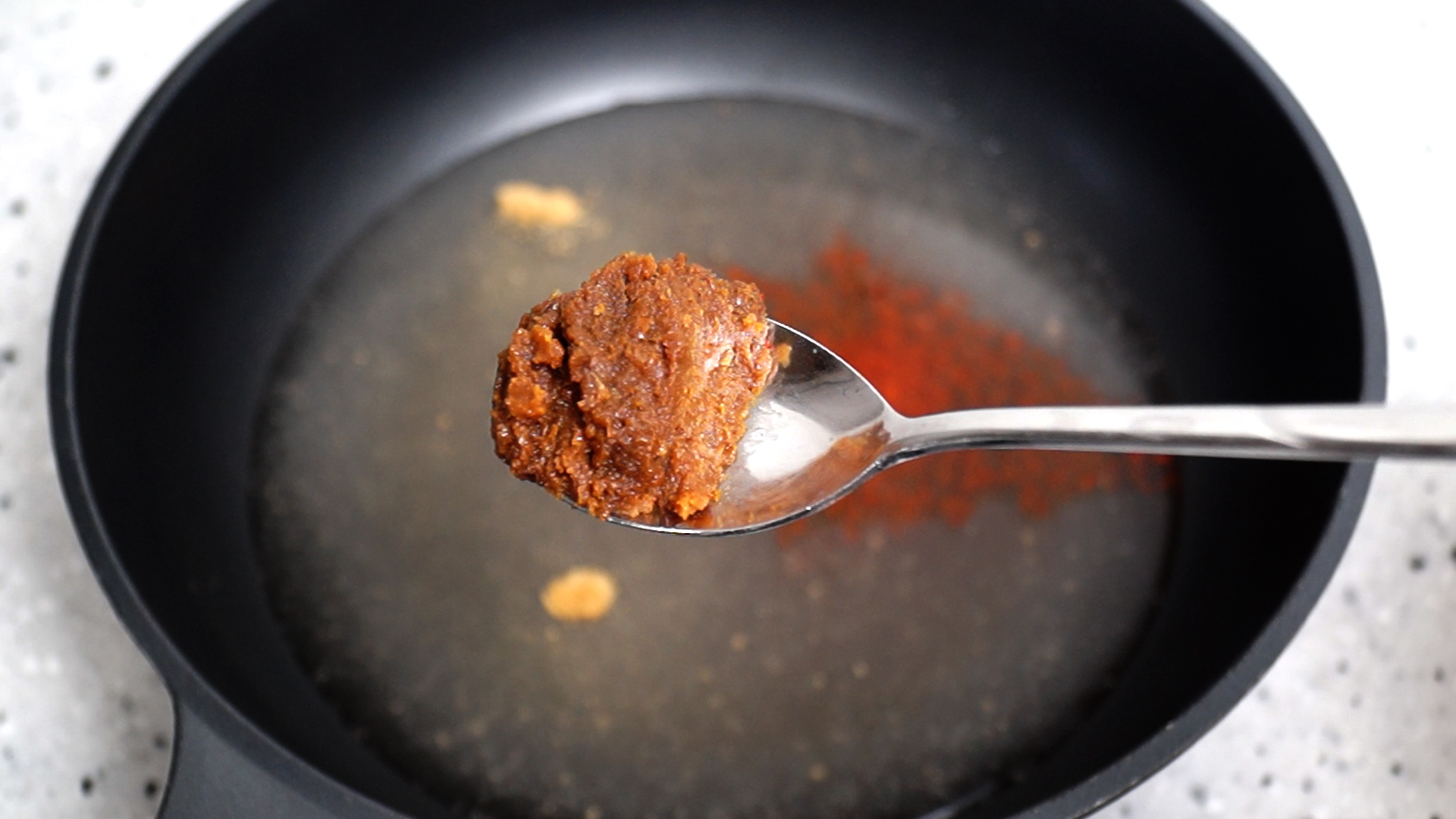 7. 불을 올리고 된장을 풀어주세요. 오래보관한 된장일수록 수분이 적어 덩어리 져 있을수 있으니 잘 풀어주세요.