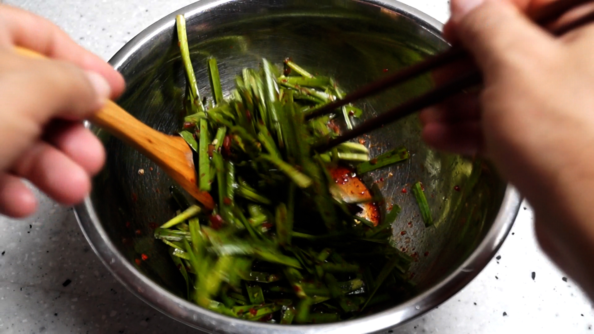 8. 부추와 청양고추를 전부 넣고 섞어둔 양념장을 전부 부어주세요