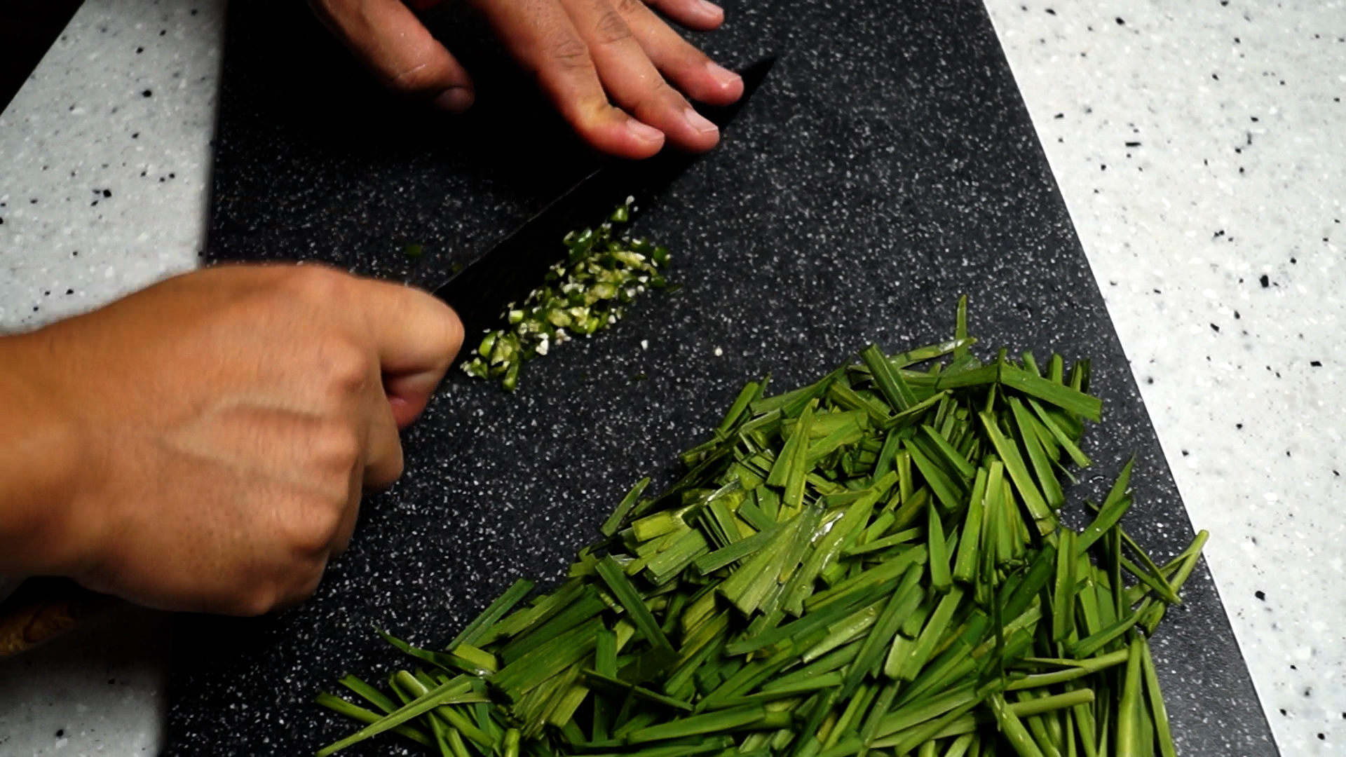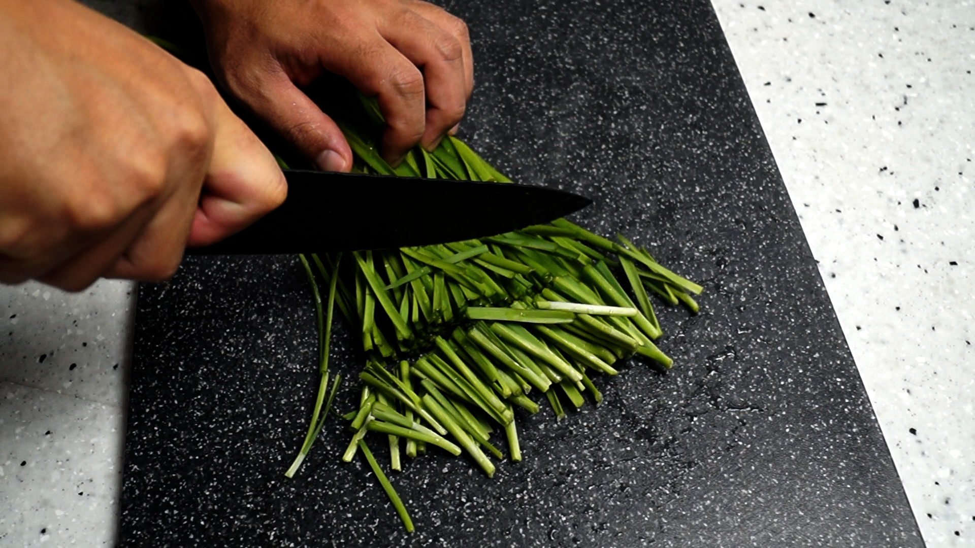 4. 부추를 1~2cm 크기로 썰어주세요. 전 좀 크게 3~4cm 정도로 썰었는데 먹을때 살짝 불편하더라고요! 입 크신 분들은 크게 썰어도 좋아요~