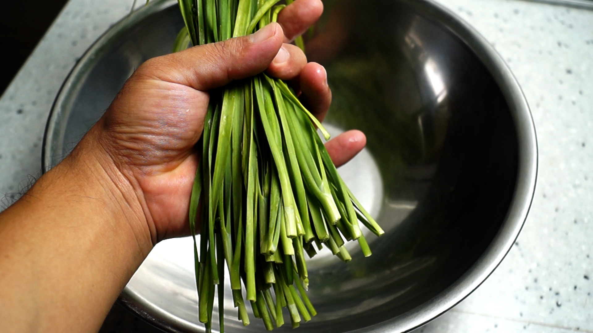 1. 부추를 가볍게 한줌 쥐어서 100g을 준비해주세요.