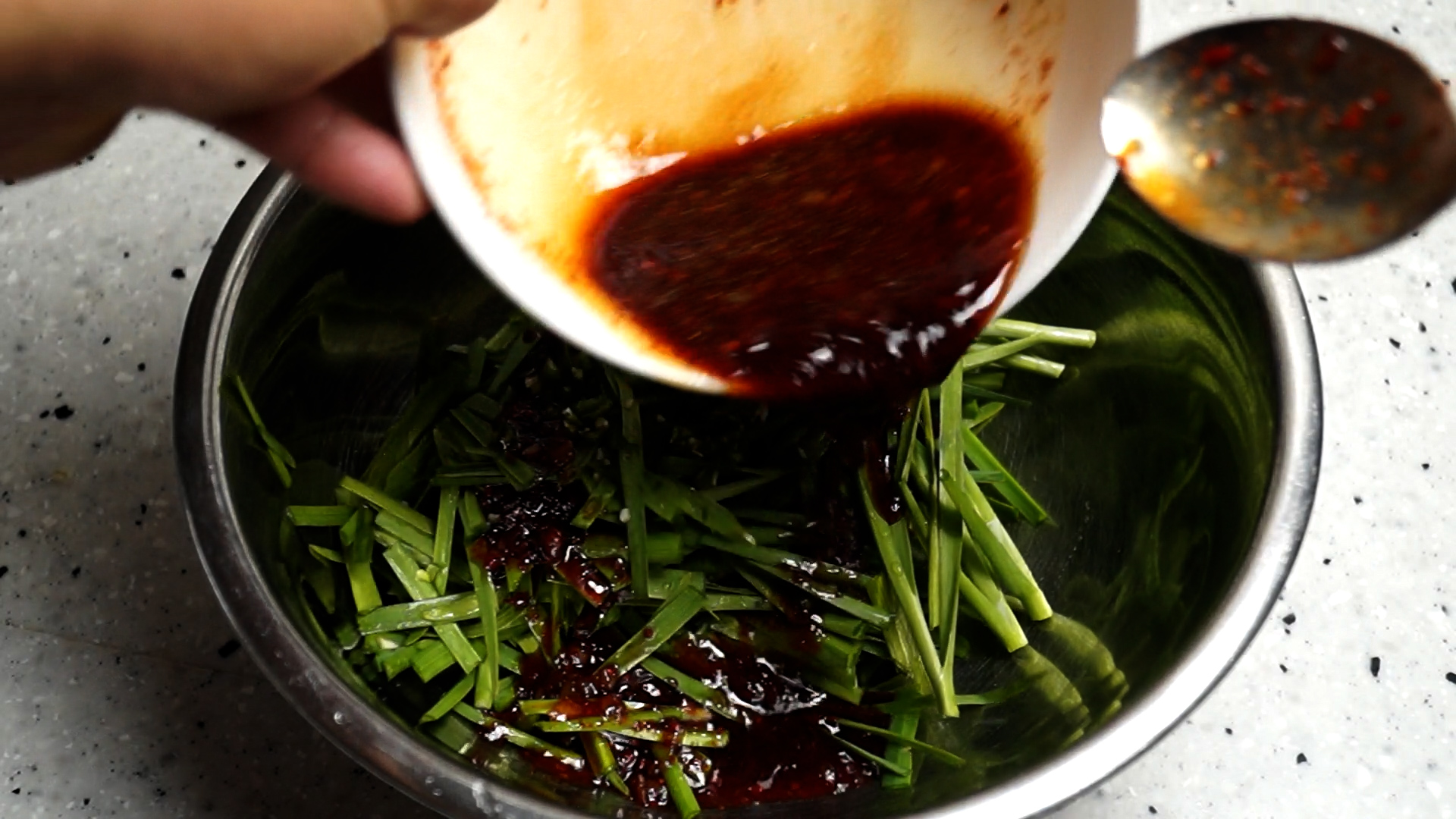 15. 부추를 적당량 올리고 간장도 입맛에 맞게 2~3스푼 퍼올려주세요.