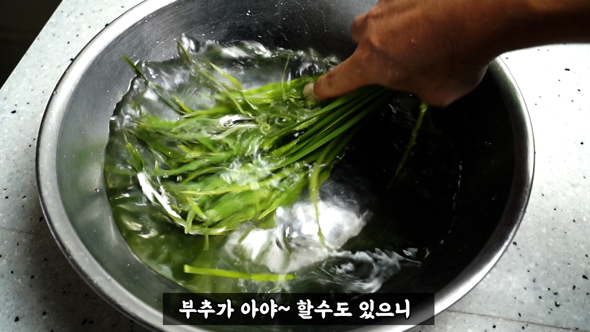 3. 불린 부추는 빡빡 문지르면 풋내가 올라올수 있으니 최대한 약하게 설설설 흩어가면서 2~3차례 헹궈주세요.