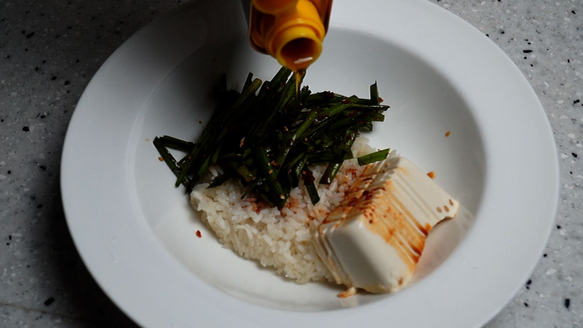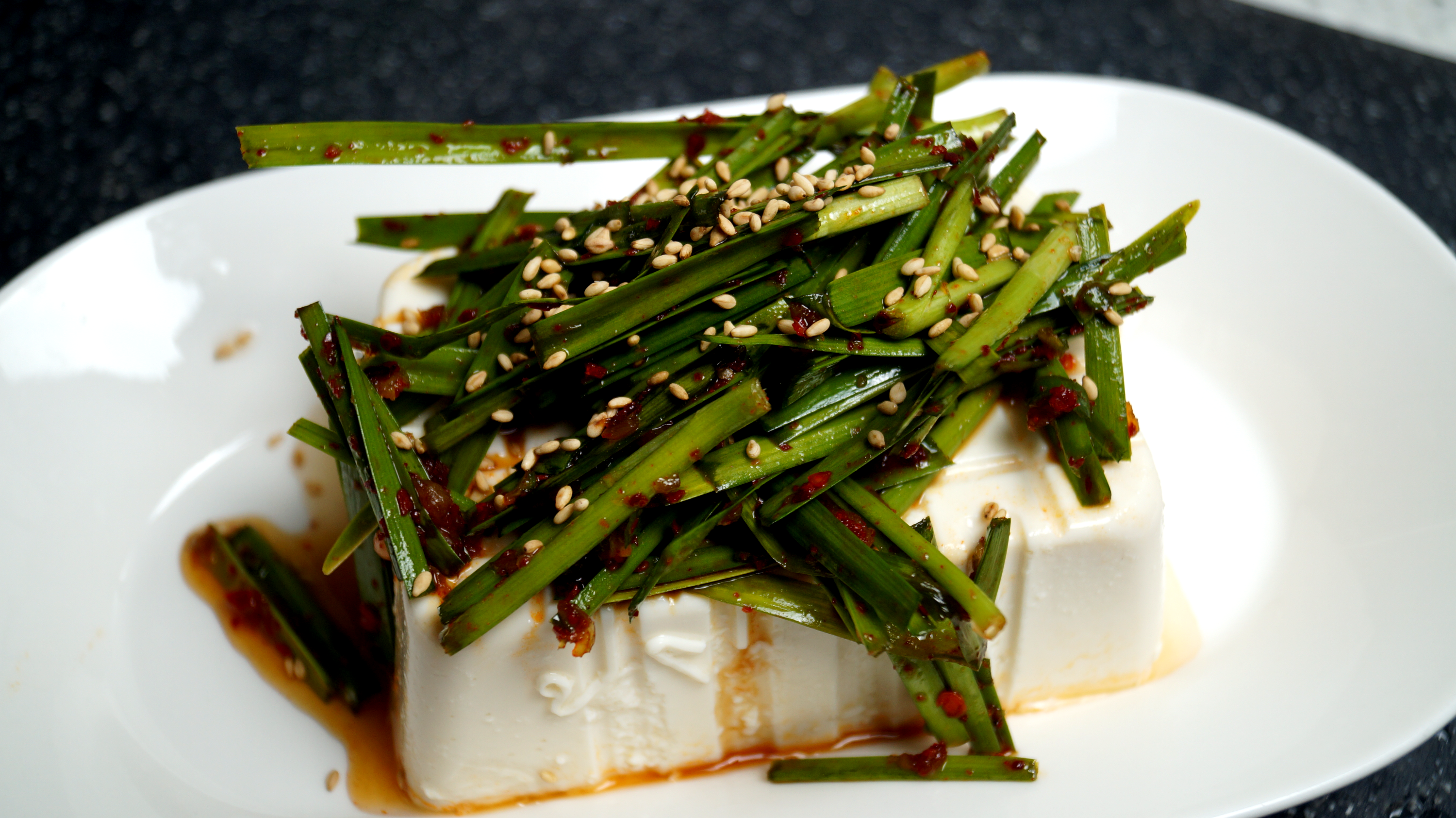 12. 연두부 위에 양념한 부추를 듬뿍 올리고 간장도 퍼서 적당히 끼얹어주세요.
