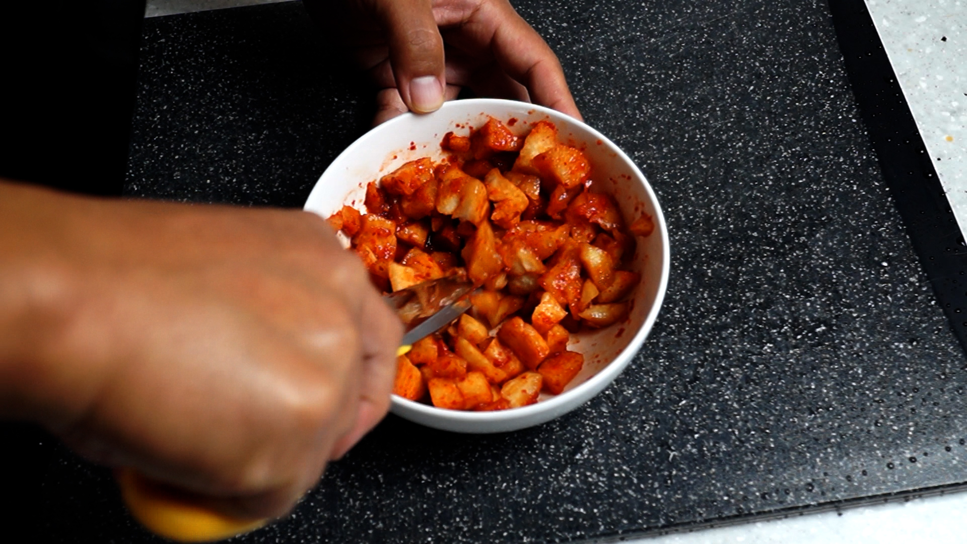 1. 적당히 익은 깍두기 170g 을 준비해서 크기가 대충 1cm 이하가 나오게 썰어주세요. 저는 도마 버리기 싫어서 가위로 잘라줬어요. 가위를 쓰면 나중에도 쓸일이 있답니다.