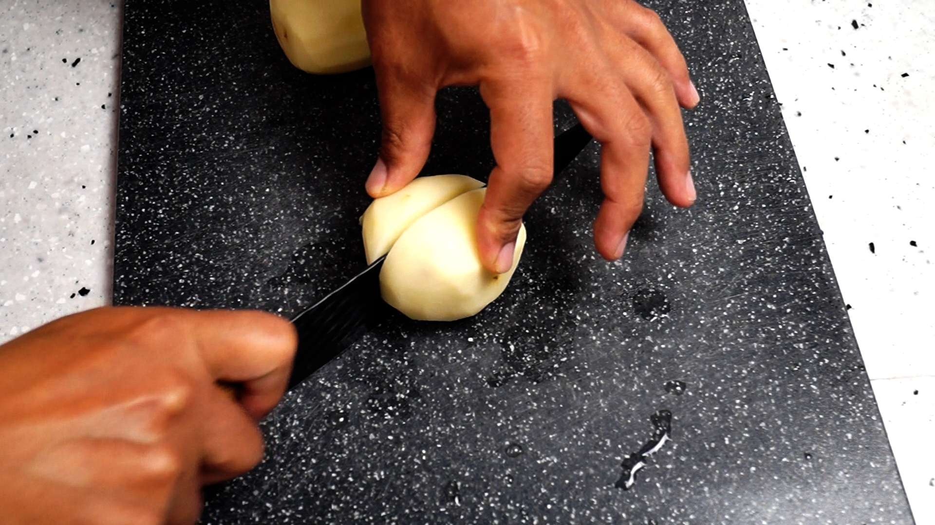 4. 감자는 평평한 부분을 도마에 대고 안정감있게! 0.5cm 정도르 좀 얇게 썰어주세요. 두꺼우면 안익을수 있으니 꼭 얇게 썰어주세요.