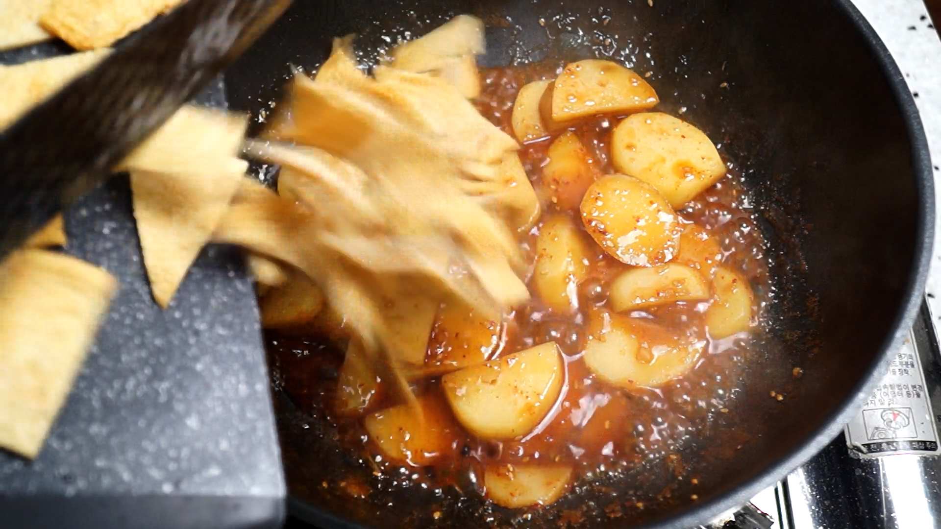 14. 감자가 익었으면 어묵을 넣어주세요. 혹 어묵을 넣는데 양념이 완전히 쫄아 붙었다면 물을 조금 넣어서 어묵이 복아질 양념이 있게 만들어주세요.