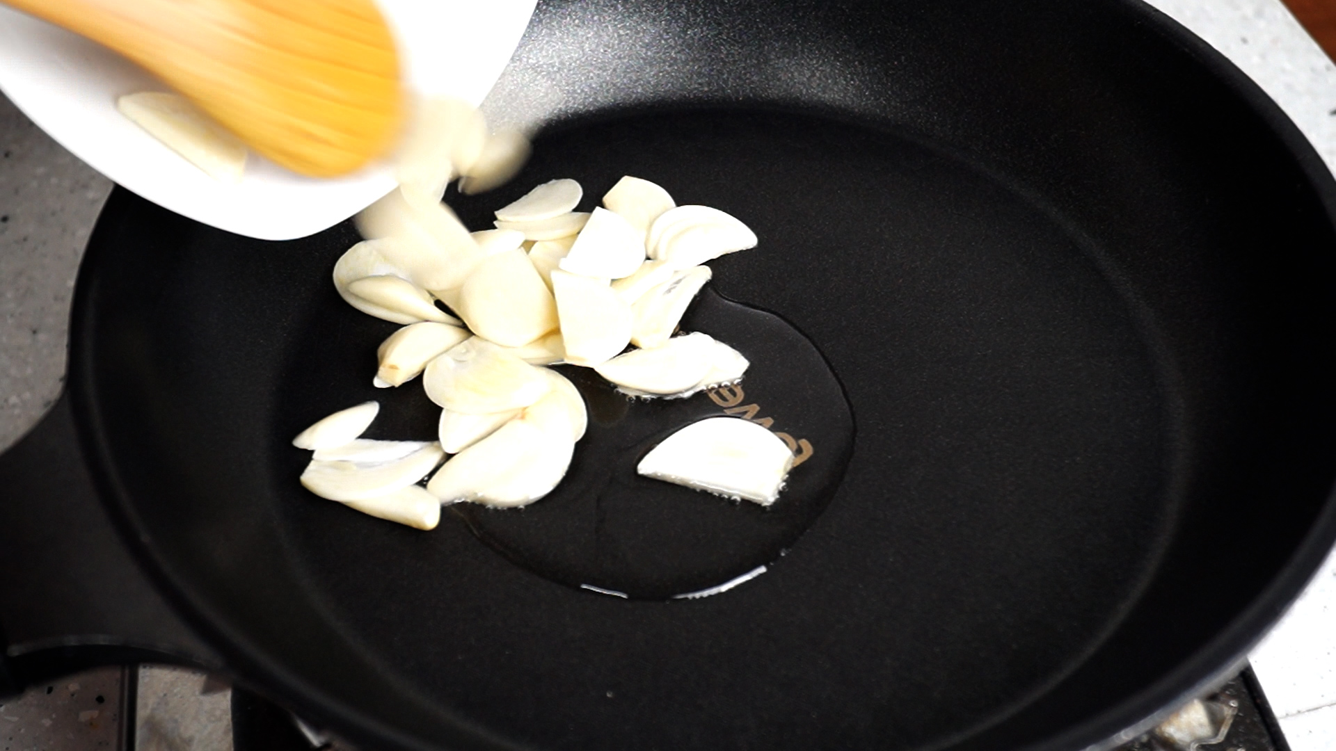 12. 약불로 기름을 달군 다음 마늘을 넣어주세요.