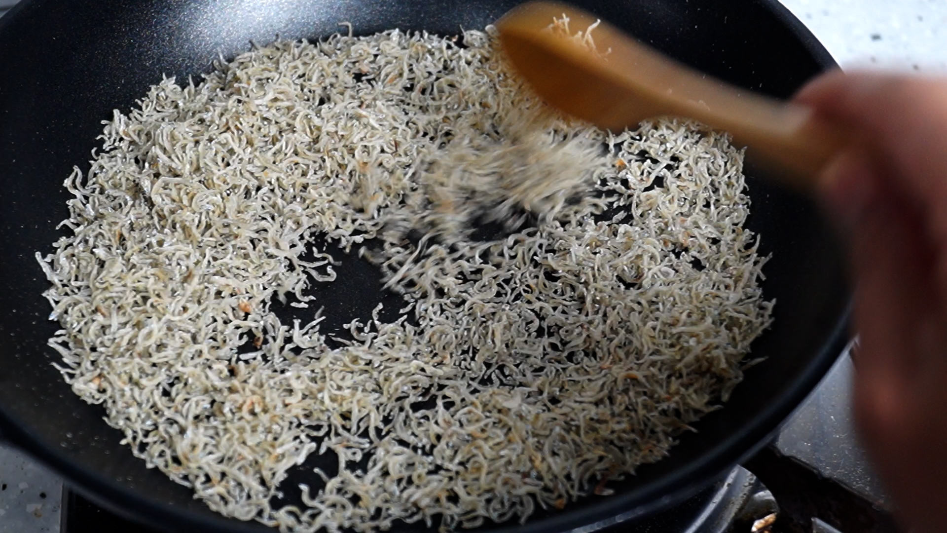9. 약불로 예열된 팬에 멸치를 붓고 천천히~ 2~3분 정도를 볶아 주세요. 살짝 볶아 수분을 날려서 식감도 잡고 비린내도 잡을수 있으니 꼭 살짝 볶아주세요.