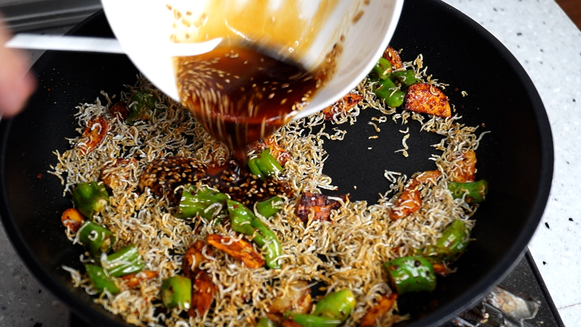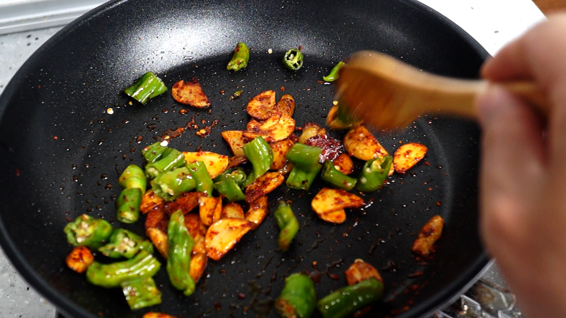 16. 꽈리고추를 넣고 1분 정도를 더볶아주세요.