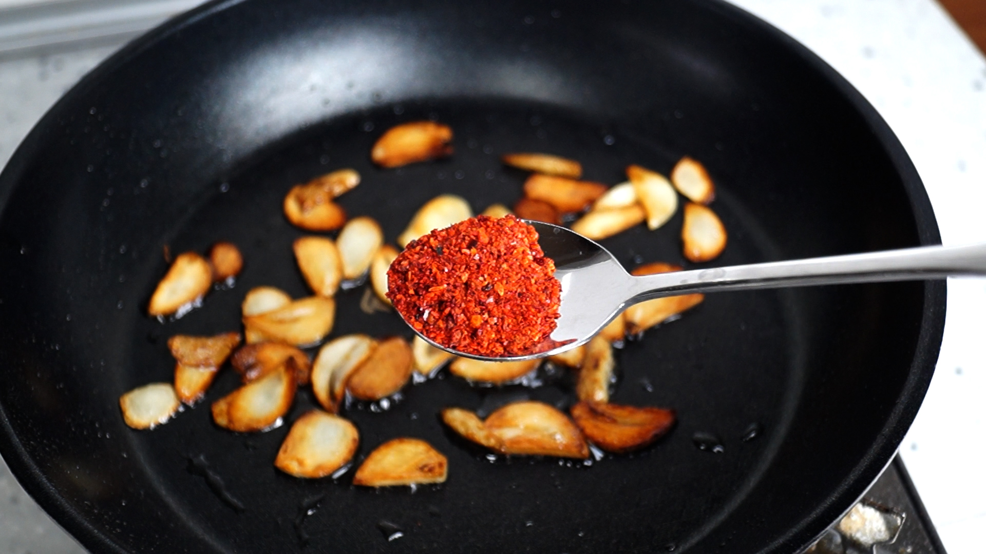 15. 노릇하게 구운 마늘에 고추가루 반스푼 정도를 붓고 약불유지하고 1분 볶아주세요.