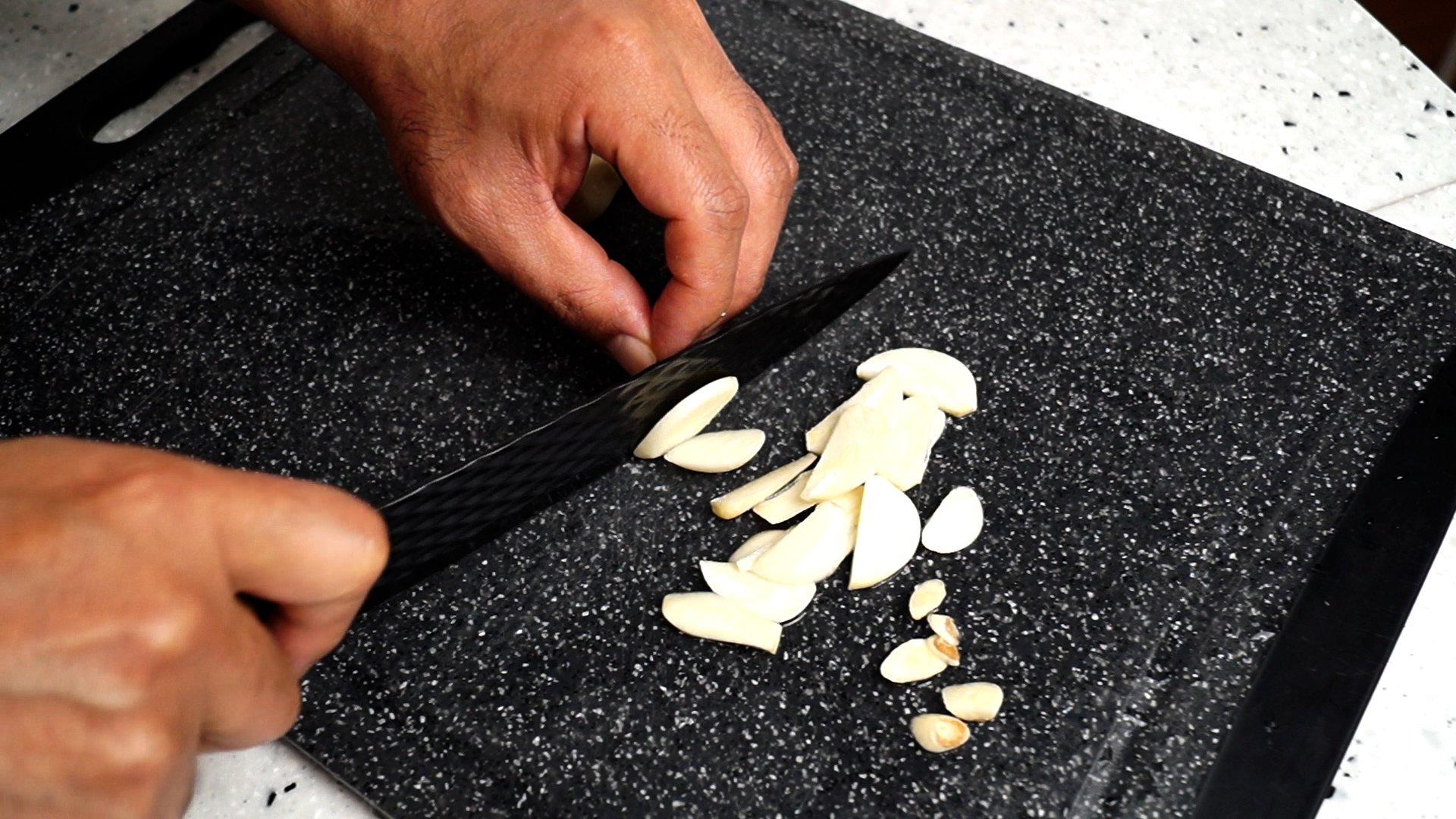 4. 마늘을 편으로 2~3mm 두께로 썰어주세요. 써는게 힘드시면 마늘 슬라이스 같은 기계를 사용하세요.