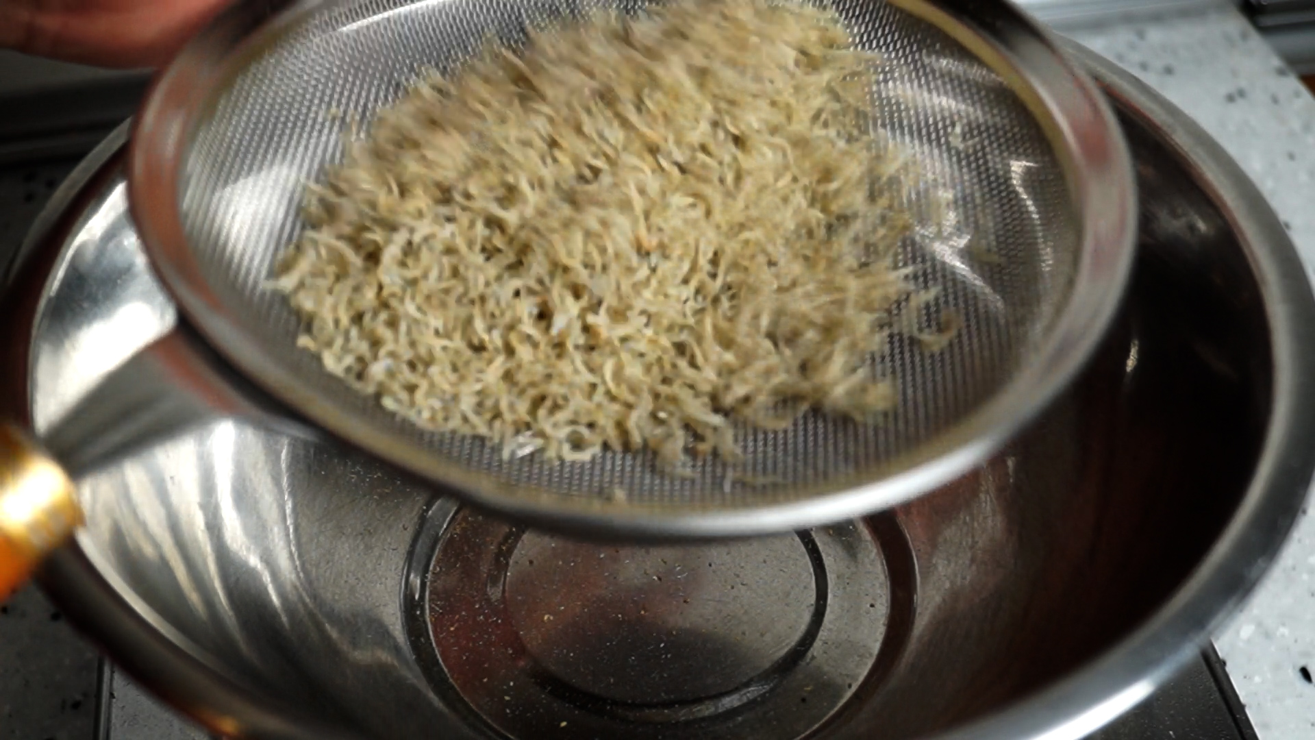 10. 멸치를 채에 올려 가루를 털어주세요. 채가 없으시면 생략하셔도 되지만 가루를 털어주면 좀더 갈끔하게 볶을수 있습니다.