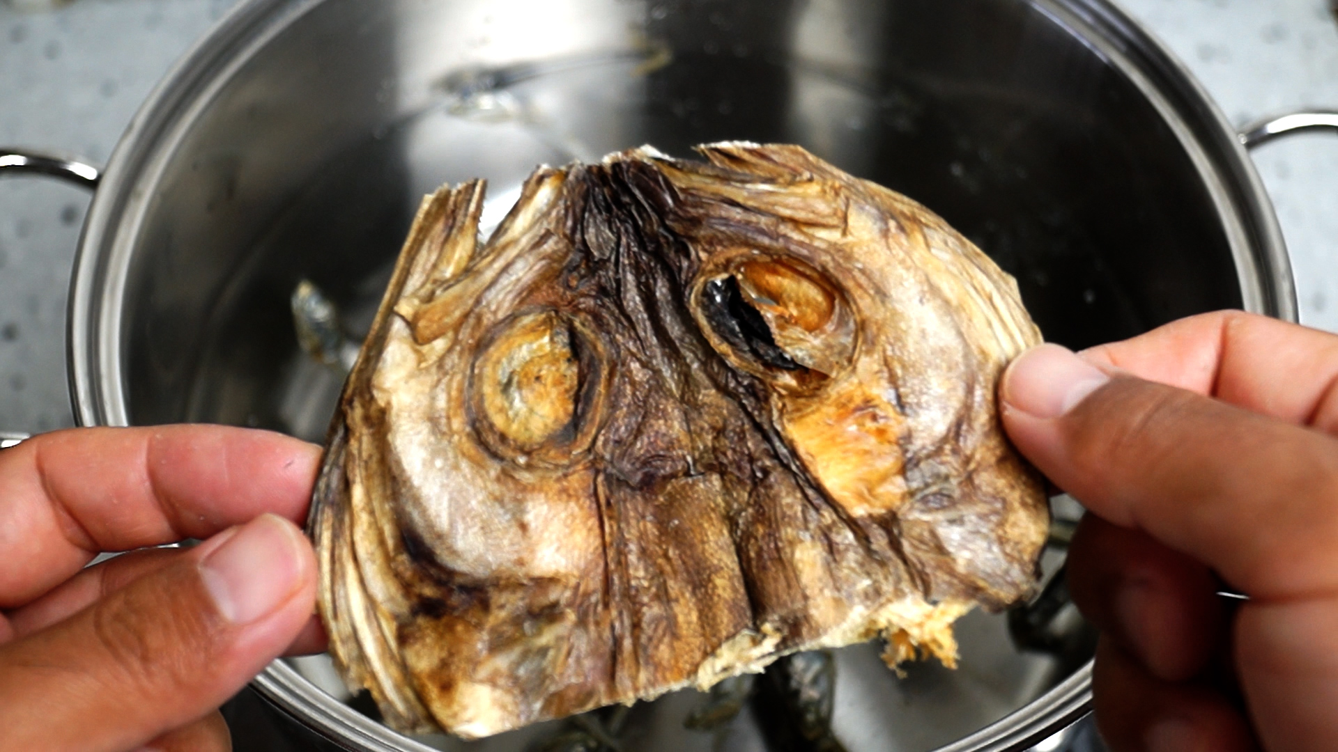 6. 황태 또는 북어대가리 1개를 넣어주세요. 없으시면 대멸을 10마리 더 넣어주세요.