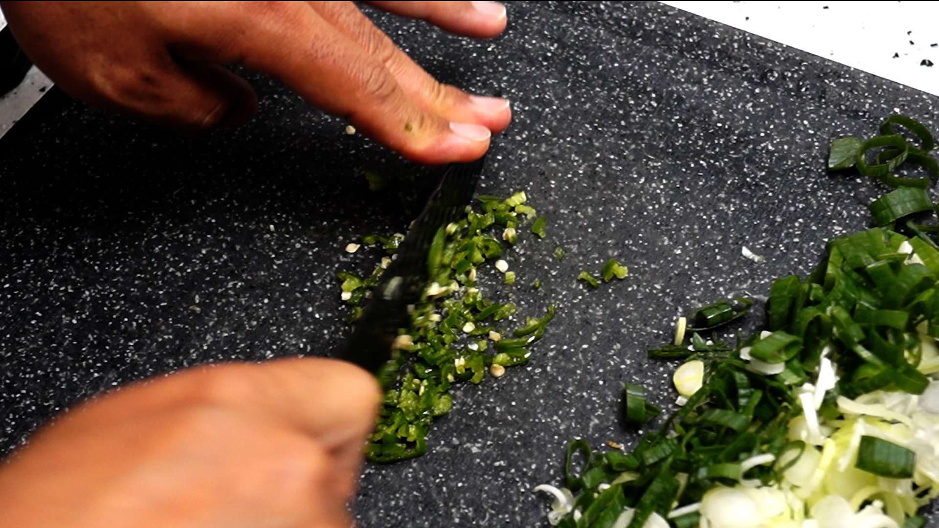 3. 겉이 딴딴한 청양고추는 잘못하면 칼이 미끄러져 손이 베일수도 있으니 이렇게 칼날로 꾹꾹 눌러 숨을 좀 죽인 다음 썰어주시는것도 좋아요~