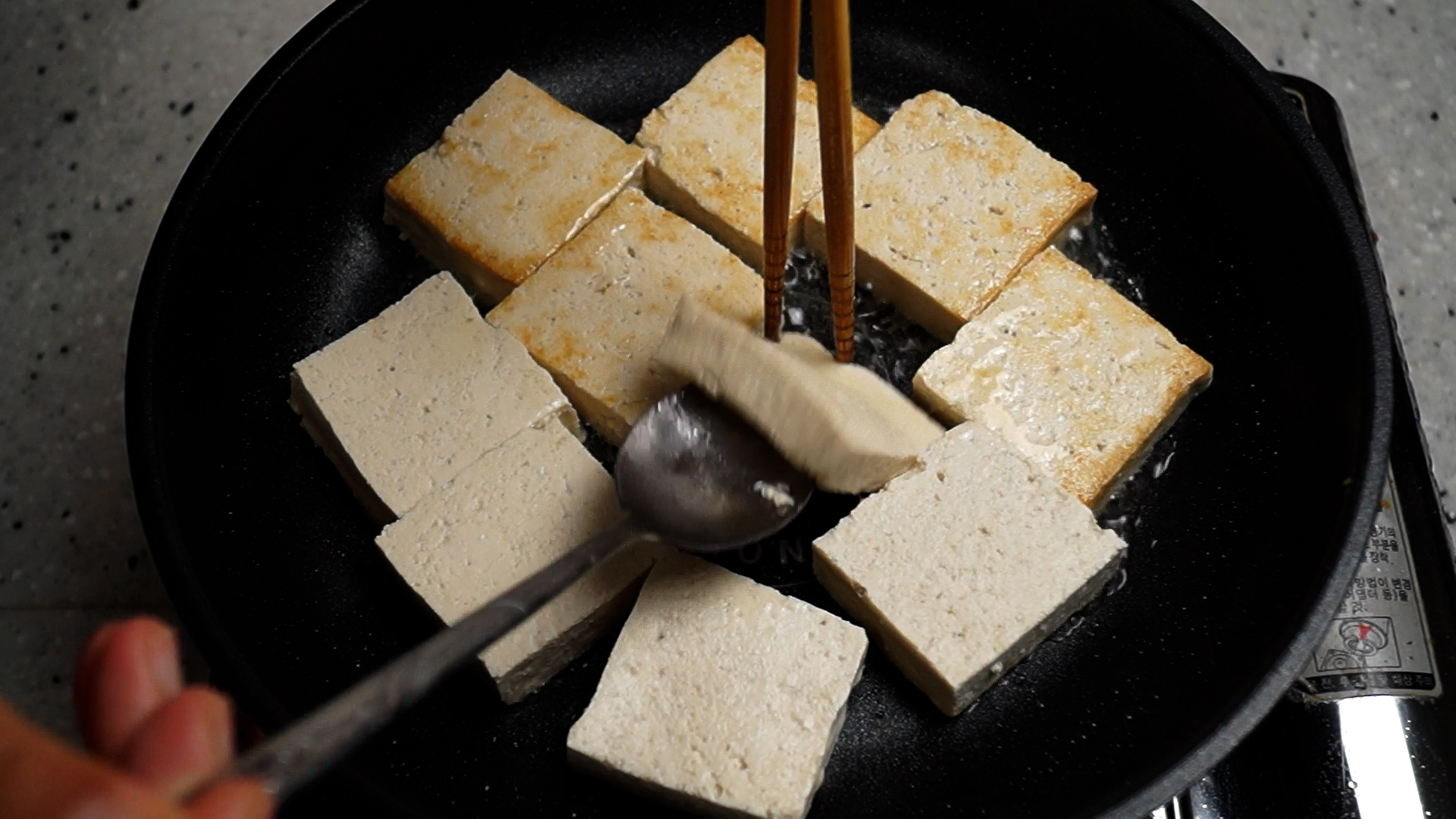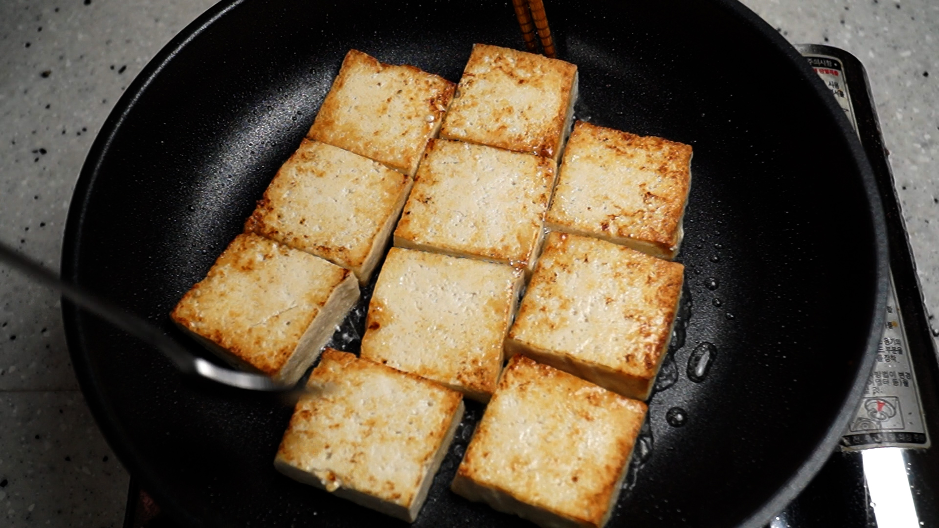 22. 팬에 이렇게 두부가 꽉! 차면 기름이 튀어오르는 일이 적어져서 기름 튀어서 손데일 확률도 줄어든답니다~