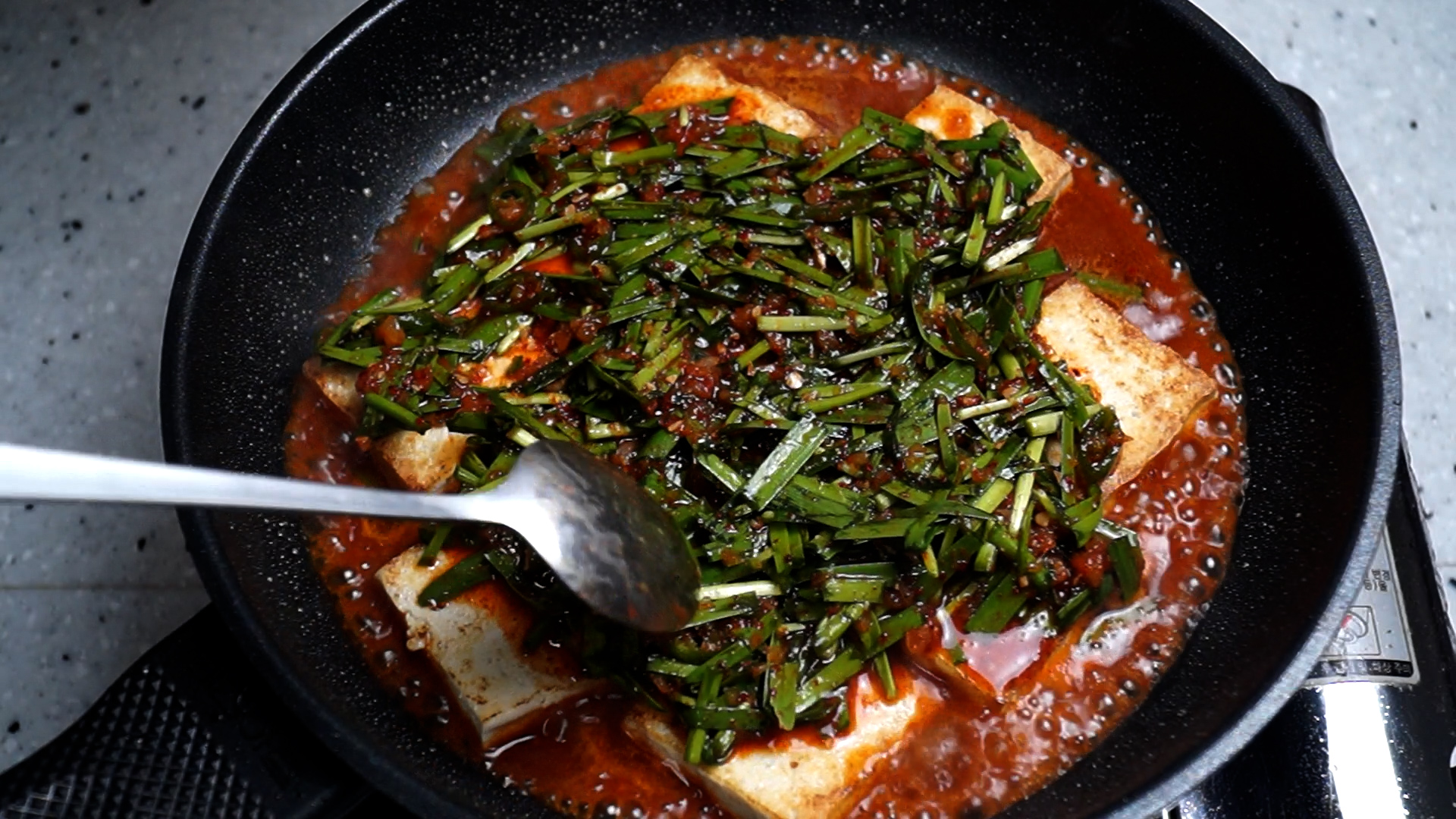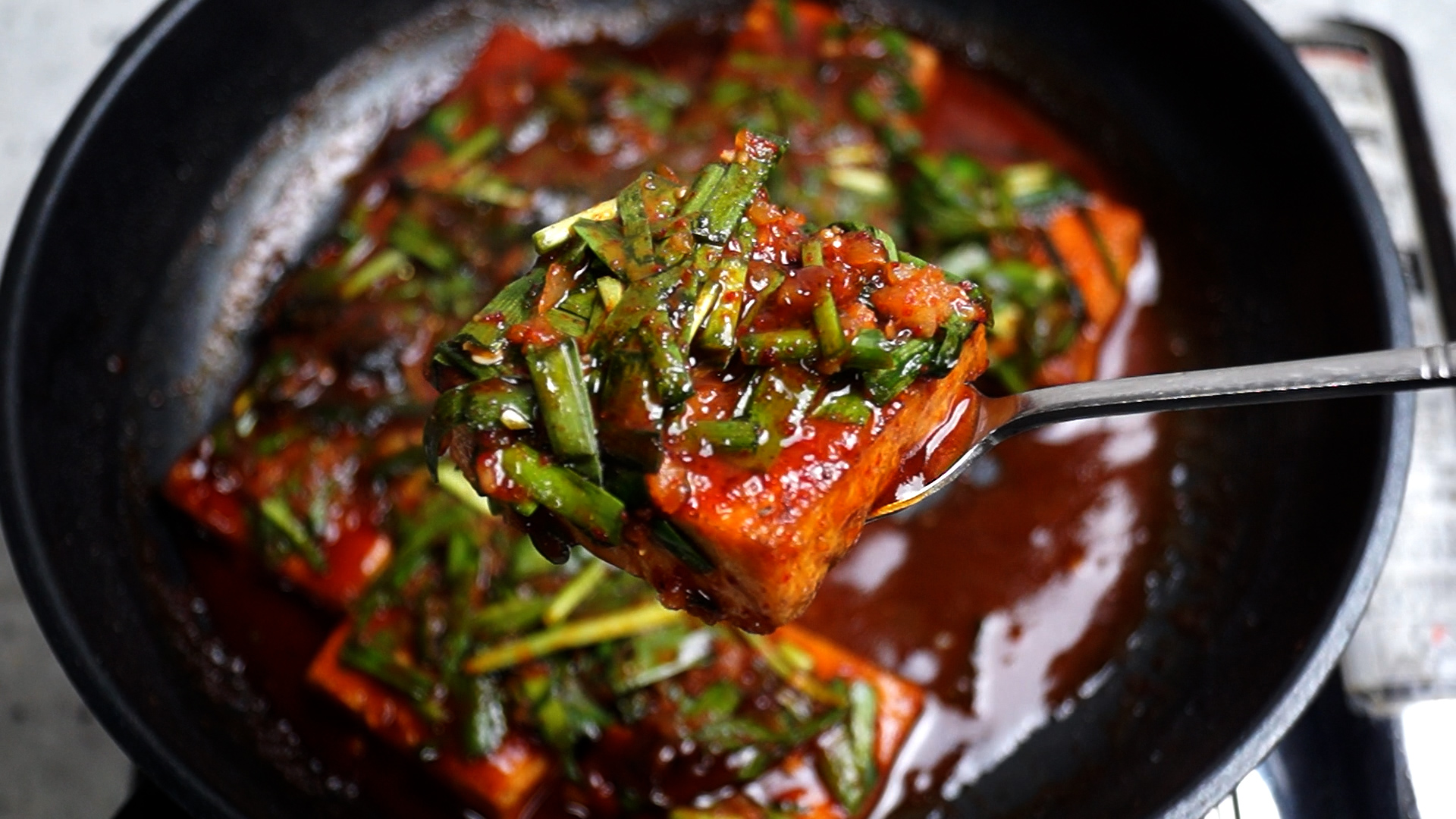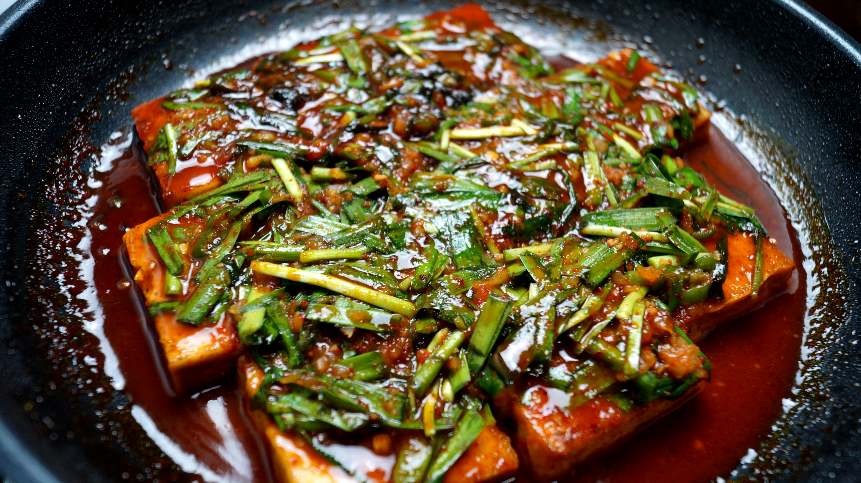 26. 아까 만든 부추 양념장을 두부위에 골고루 끼얹어주세요.