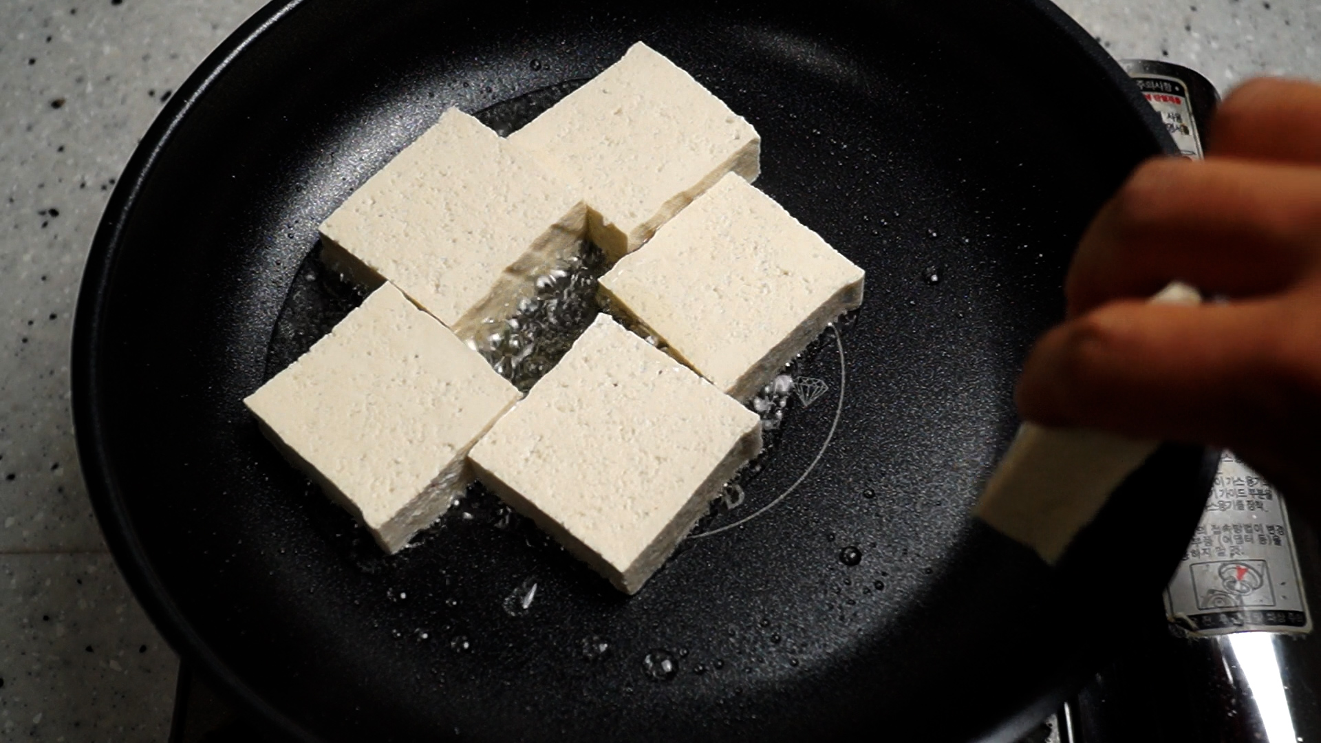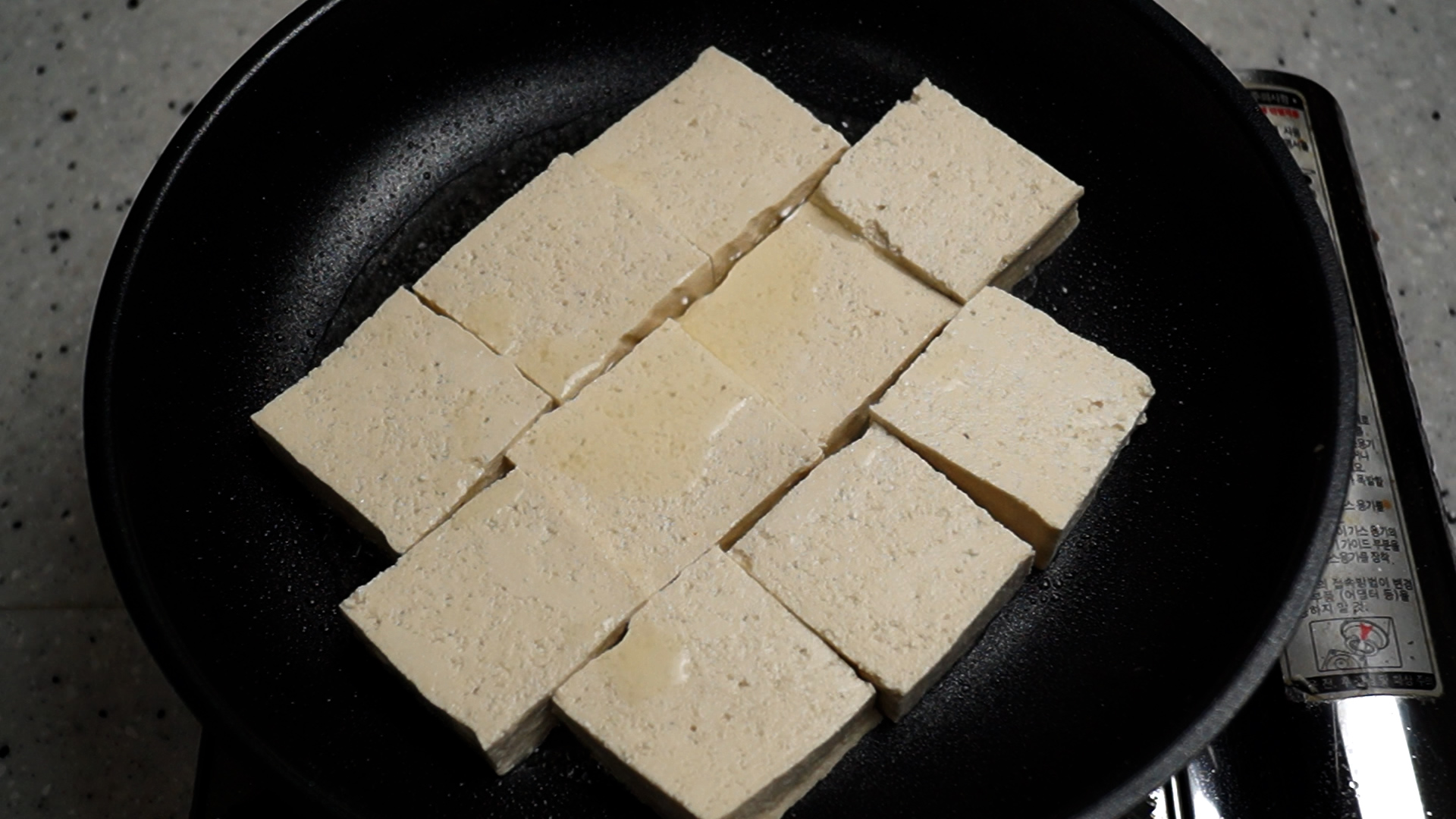 21. 기름을 강불로 달궈서 두부를 전부 넣어주세요. 오늘은 두부 수분빼고 밑간하고 전분 뭍히고 이런거 없이 바로 기름에 구워줄거에요
