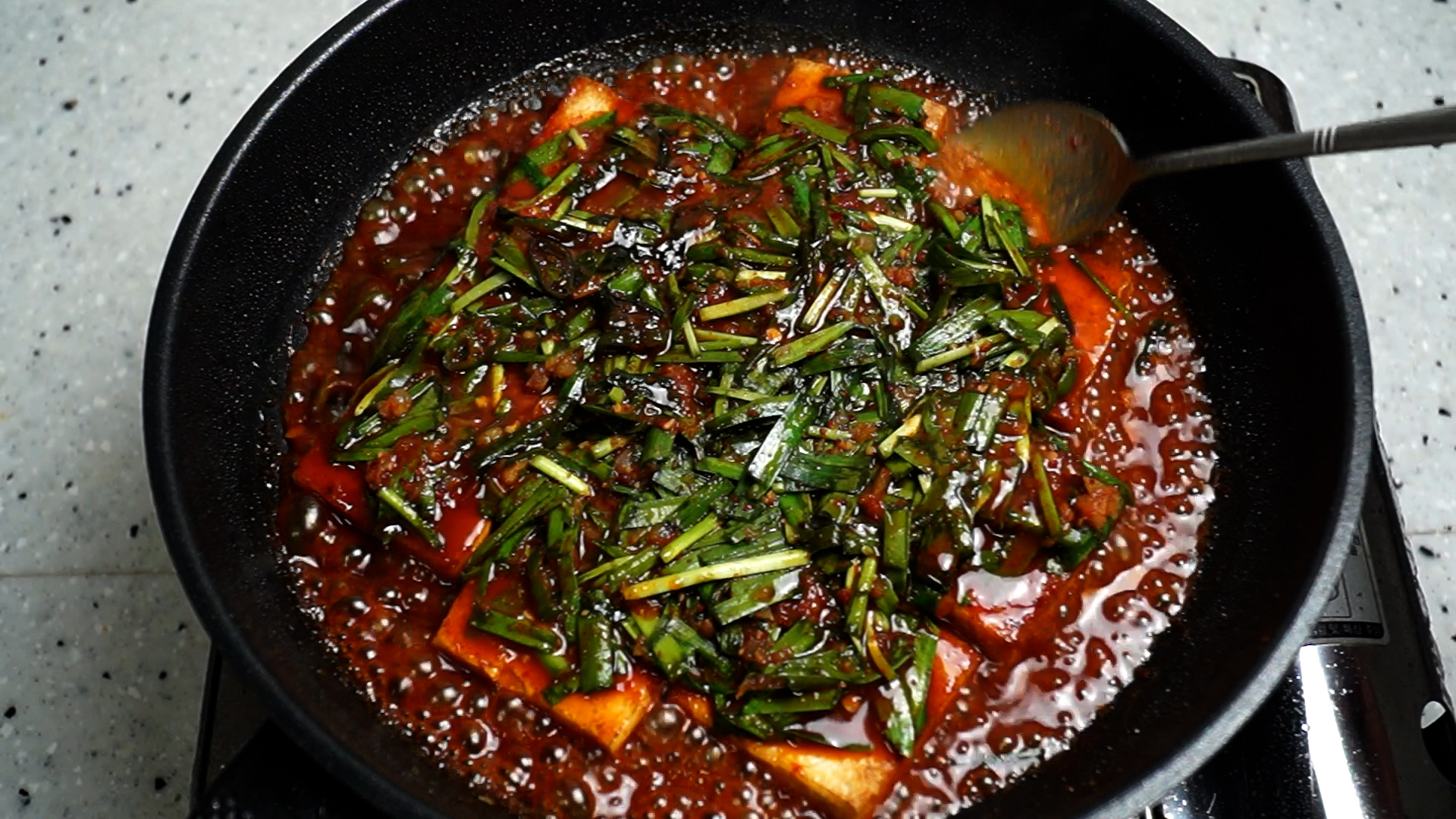 18. 썰어둔 부추와 청양고추를 넣어주세요.
