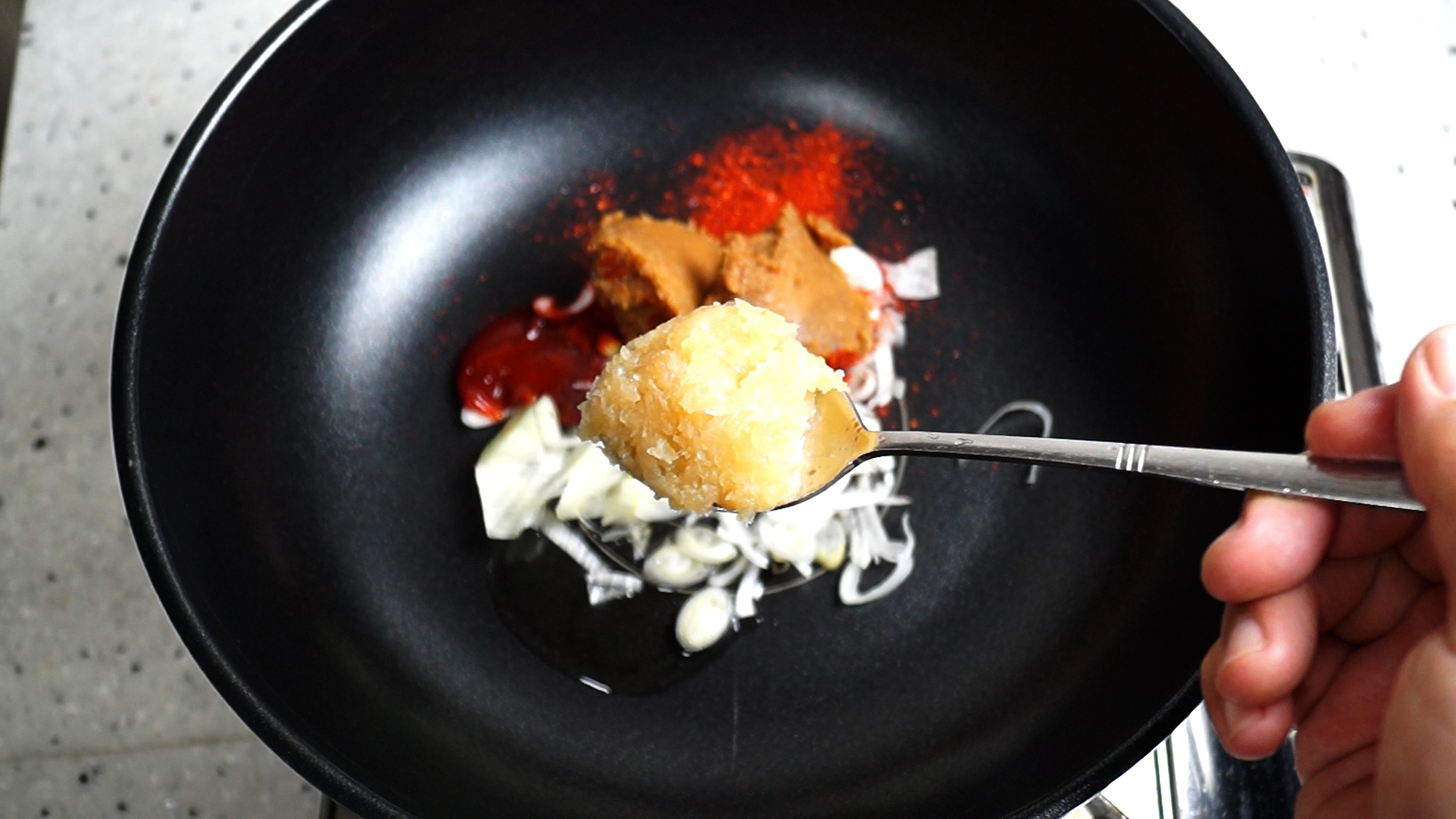 17. 불을 강불로 올리고 팬에 열이 오르기 전까지 고추장 된장이 골고루 풀어지게 섞어주세요.