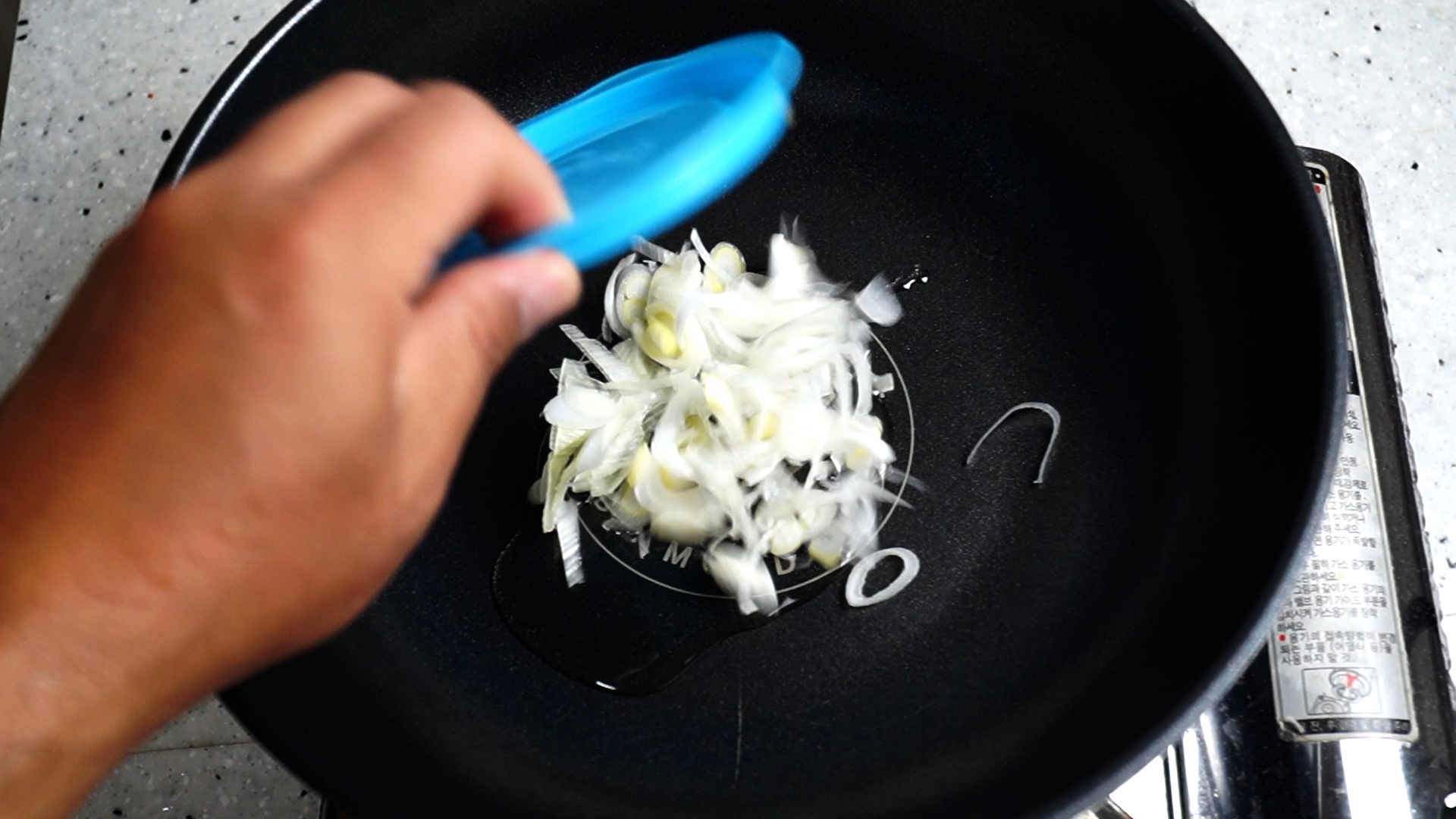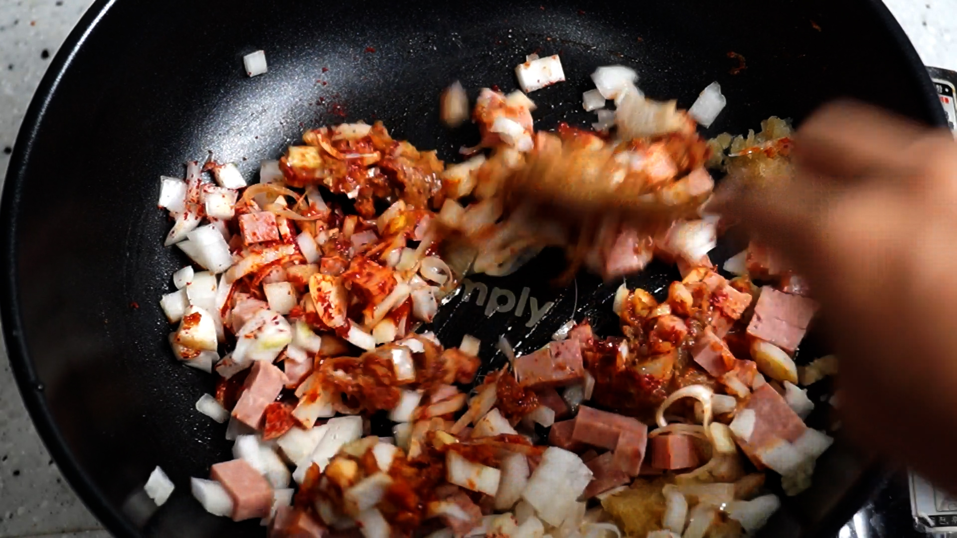 16. 썰어둔 양파와 통조림햄을 전부 넣어주세요.