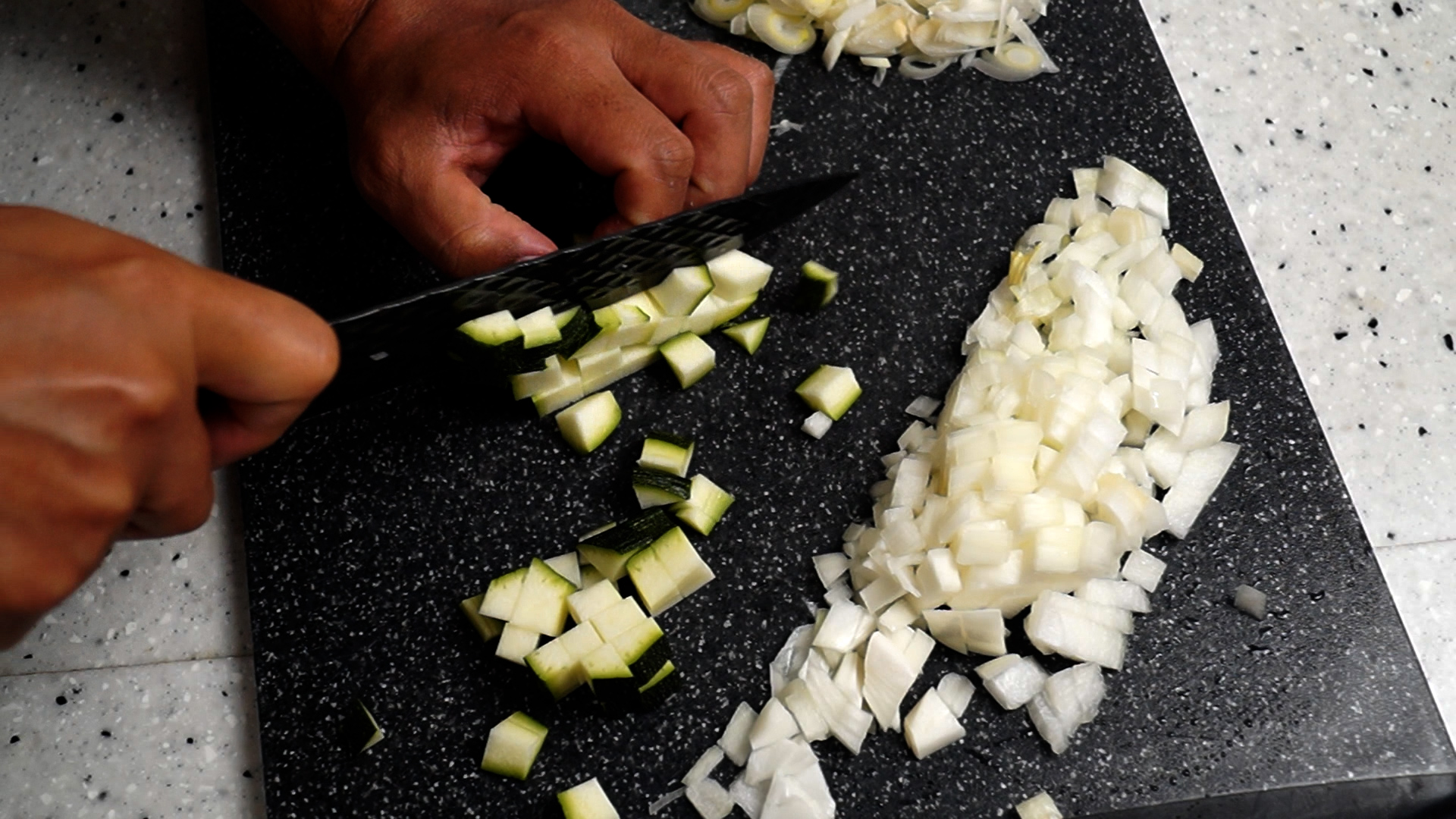4. 애호박 또는 긴호박 100g 을 1cm 크기로 깍둑썰기를 해주세요.