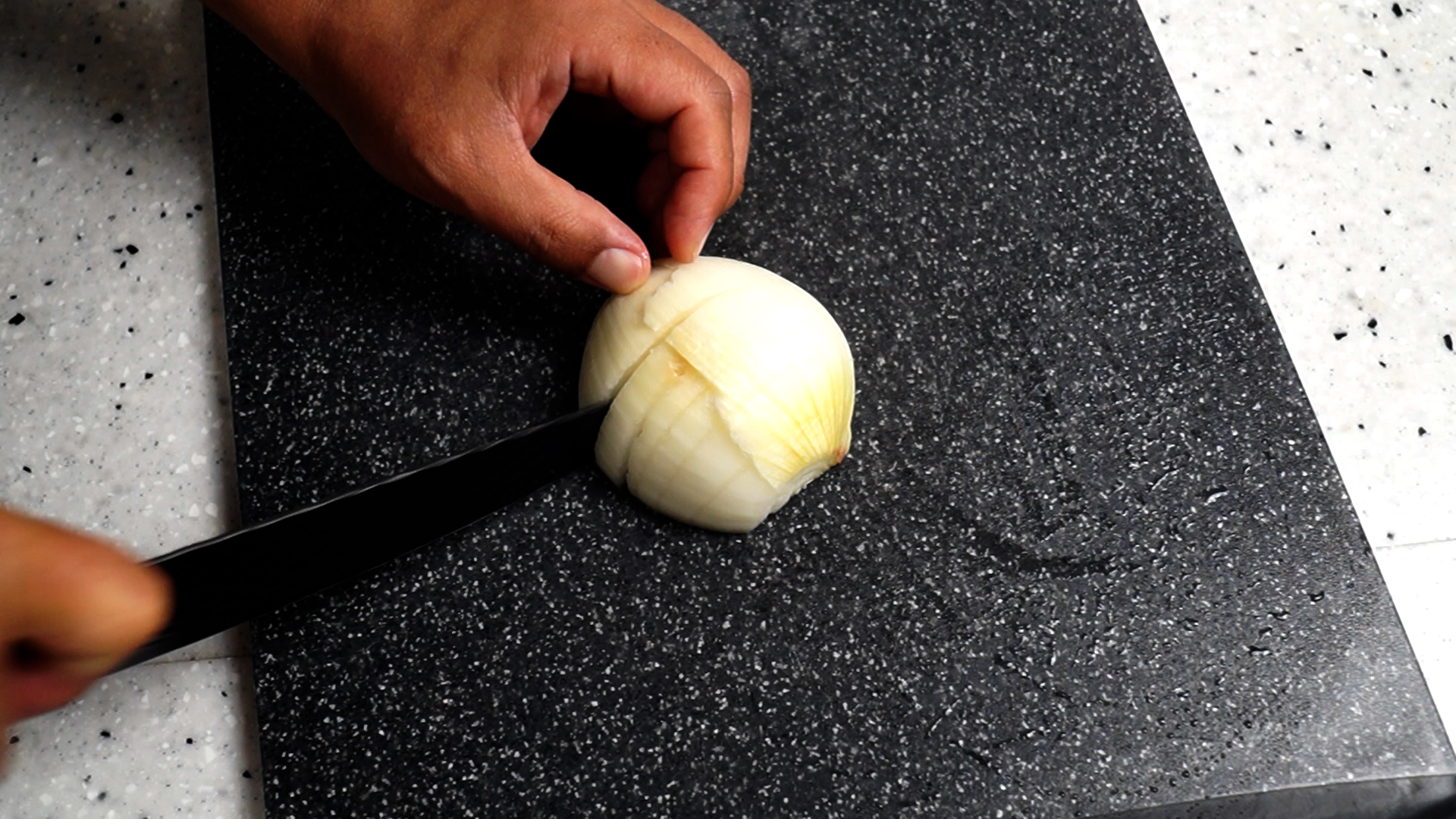 2. 칼집들어간 결 반대로 다시 1cm 간격으로 썰어주시면 쉽게 가로세로 1cm 양파를 써실수 있습니다. 꼭 이방법 아니더라도 기호에 맞게 양파를 썰어주시면 됩니다.
