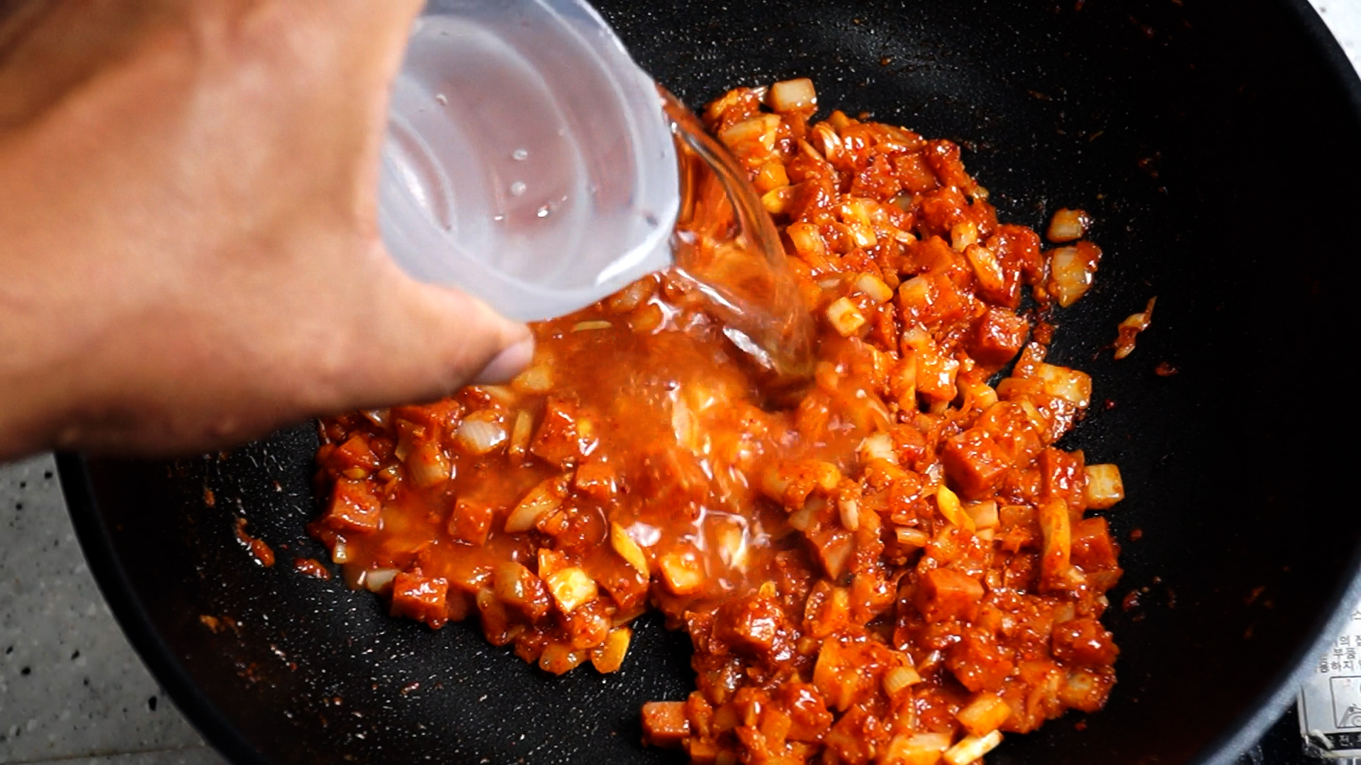 19. 2~3분 볶다보면 양념이 슬슬 늘러붙기 시작하는게 보일겁니다. 그때 물 600cc를 부어주세요.
