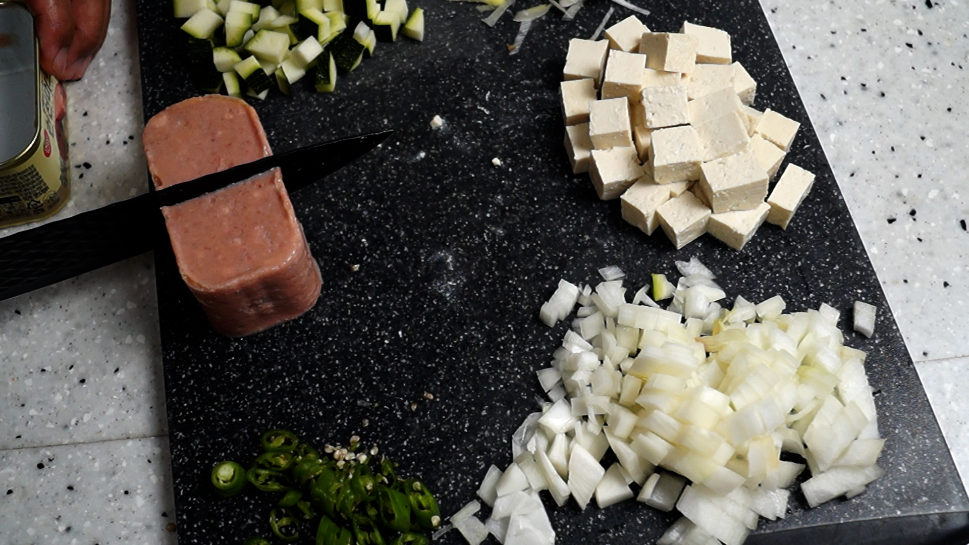 8. 통조림햄도 1cm 정도 크기로 깍둑썰기를 해주세요. 재료들은 거의 비슷한 크기로 썰어야 나중에 숟가락으로 퍼먹기 좋아요~ 차돌박이 쓰실거면 햄대신 차돌을 동량 넣어주시면 차돌된장술밥이 됩니다.