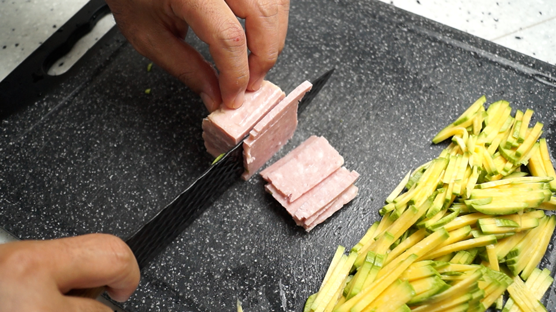 3. 스팸 또는 리챔을 호박 처럼 너무 두껍지 않게 채를 썰어주세요. 기호에 따라 뜨거운 물에 한번 데치는것도 좋아요. 데칠때는 통으로 데치는 것보다 잘라서 데치는게 기름도 더 많이 빠지고 아질산 나트륨 같은 색소가 더 많이 제거가 되겠죠^^