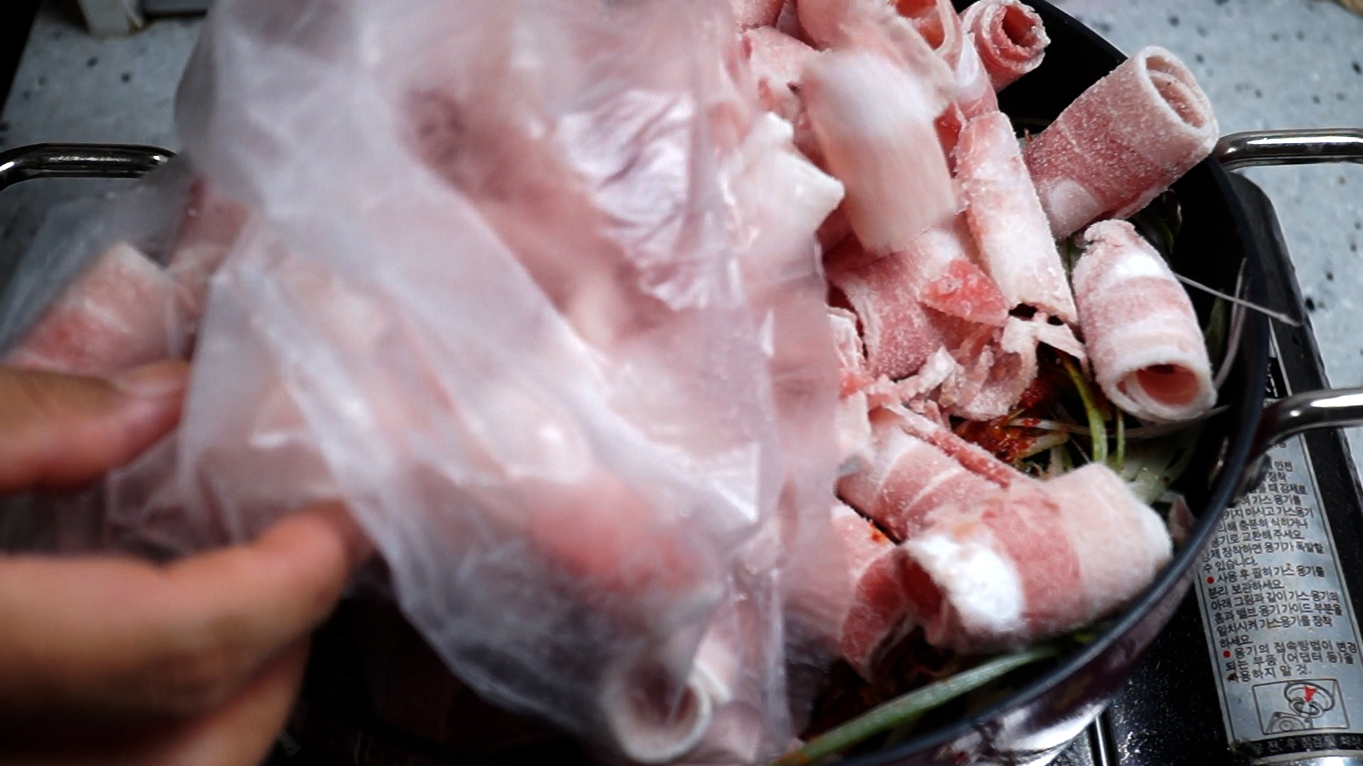 13. 대패 삼겹살을 표기된 분량껏 넣어주세요.