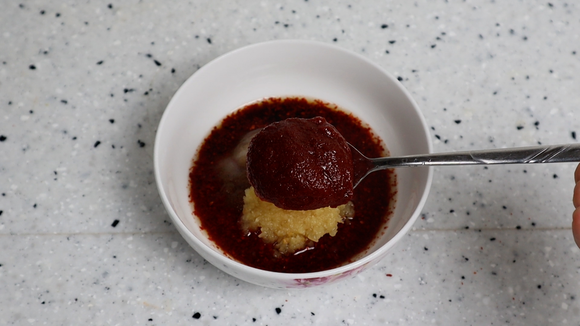 1. 양념란에 적힌 재료를 한데 넣고 골고루 섞어주세요. 고춧가루는 중간입자 고춧가루입니다. 매운맛을 올리려면 땡초가루를 절반씩 섞어보세요.
