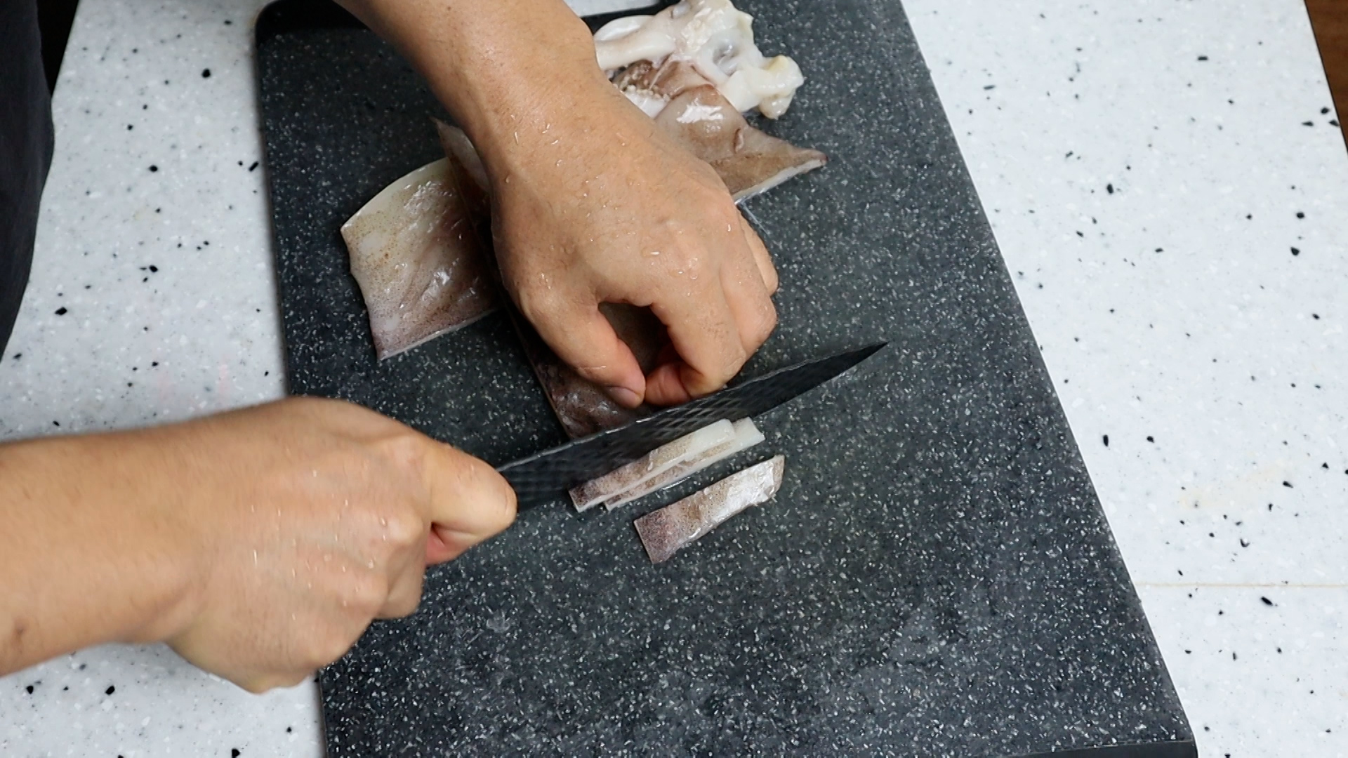 15. 오징어 껍질은 기호에 따라 뜯어내도 되고 그냥 사용하셔도 됩니다. 오징어를 먹기 좋은 크기로 썰어주세요. 오징어는 살짝 살얼음 있는 상태로 썰면 잘 썰려요~