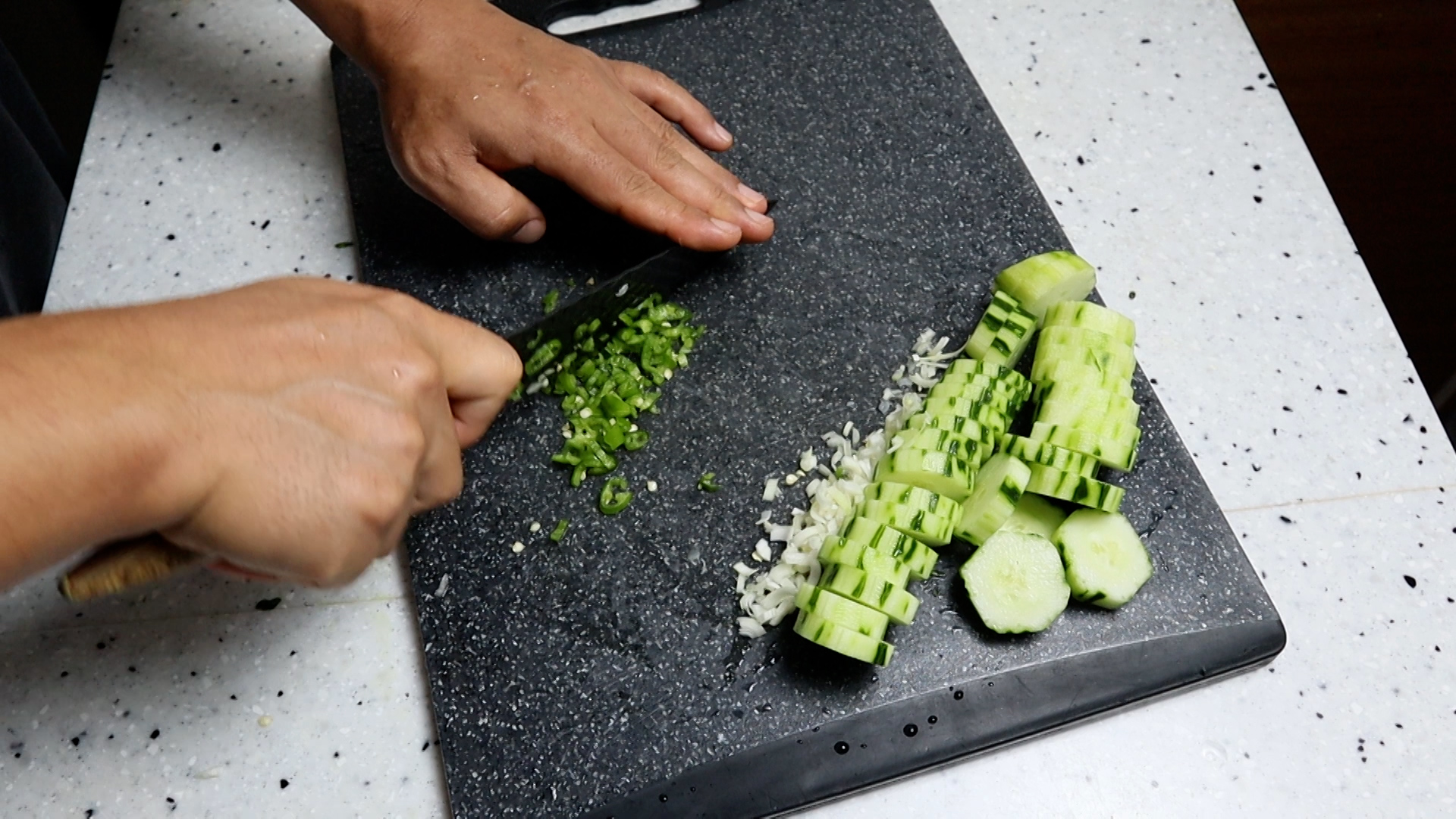 6. 볼에 참치 건더기를 넣고 오이,대파,땡초 전부 넣기