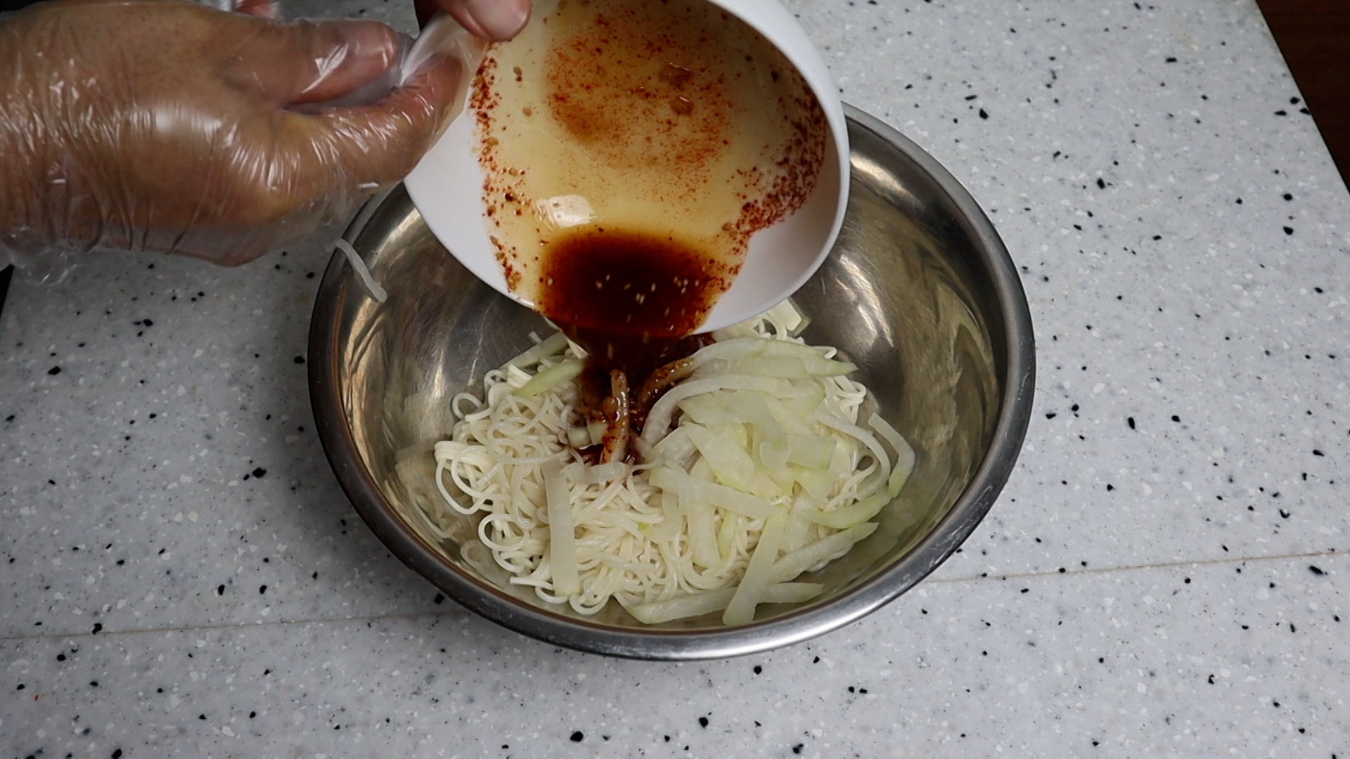 21. 젓가락으로 비비는것 보다 손으로 살짝살짝 힘주면서 조물조물 버무려주면 국수에 양념이 더 맛있게 골고루 베인답니다.