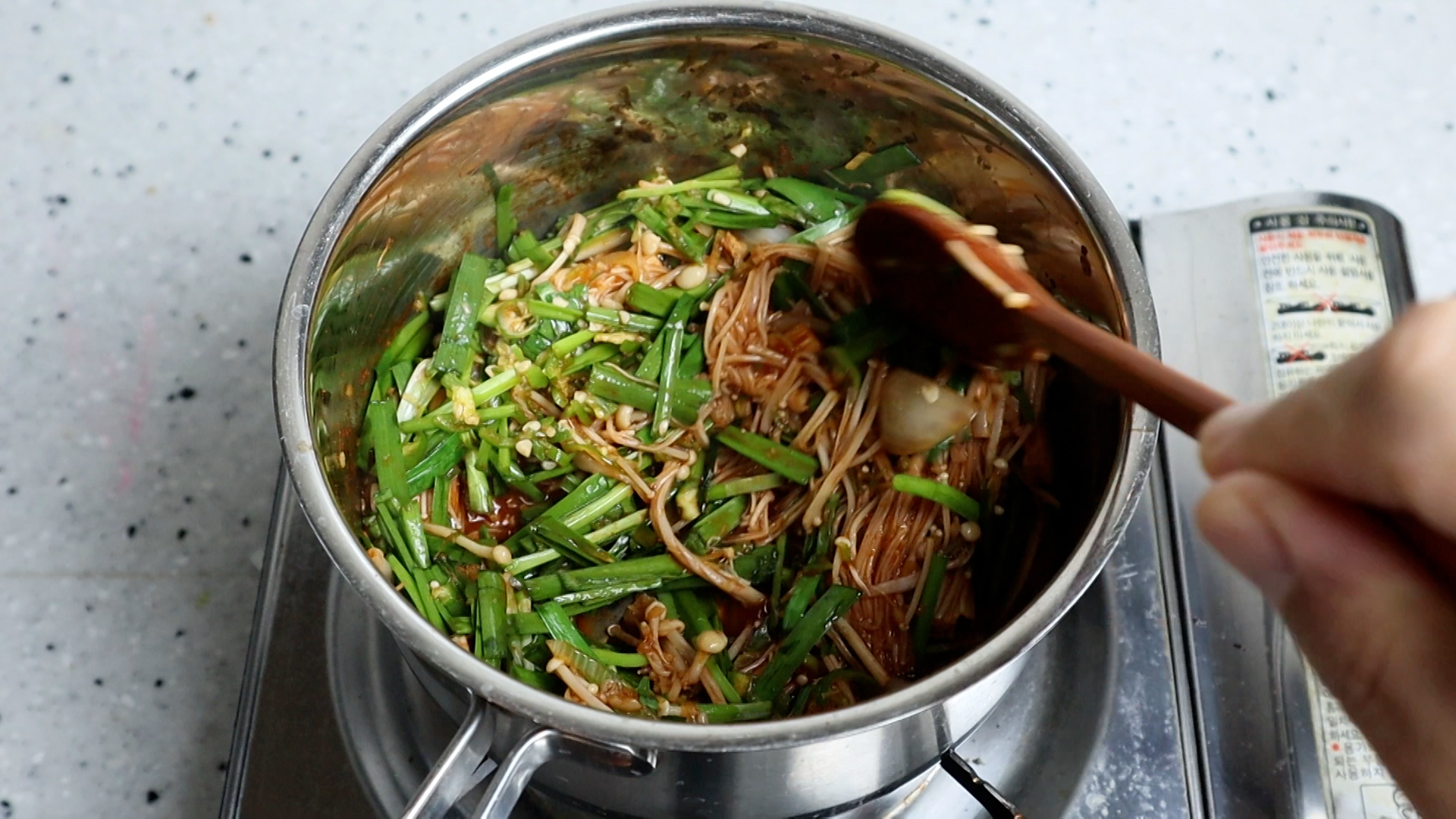18. 불을 완전히 꺼버리고 부추와 땡초를 넣어주세요.